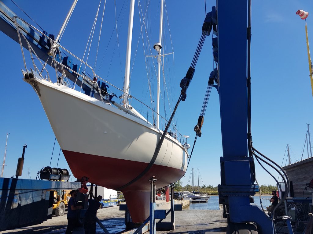 Hier ein Bild von unserem Nachbarschiff welches eine Nacht im Kran verbringen durfte: