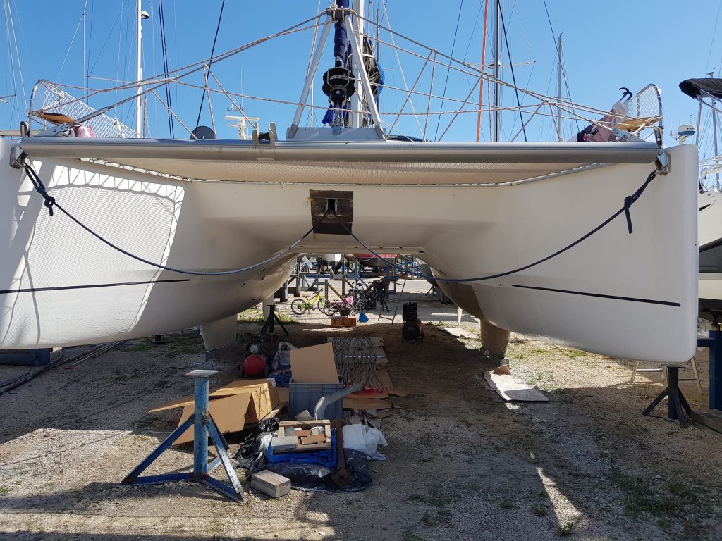 Das Unterwasserschiff wurde ja komplett entfernt. Nun wird es gerade wieder aufgebaut. Seit dem Beginn der Arbeiten am 15. April ist viel passiert. Da war der Unfall kurz vor Ende der Schleifarbeiten. Dieser Vorfall hat unsere Pläne schon mal um eine Woche nach hinten verschoben. Direkt im Anschluss wurde das Wetter so schlecht und stürmisch, dass für eine weitere Woche nichts gemacht werden konnte. Was für Yann (unseren Mann fürs Unterwasserschiff) auch besser so war. Er hätte sich keine zwei Wochen Ruhe gegönnt. Gebraucht hätte er sowieso 3 oder 4, aber das wollte er sich nicht eingestehen und hat die Zähne zusammen gebissen.