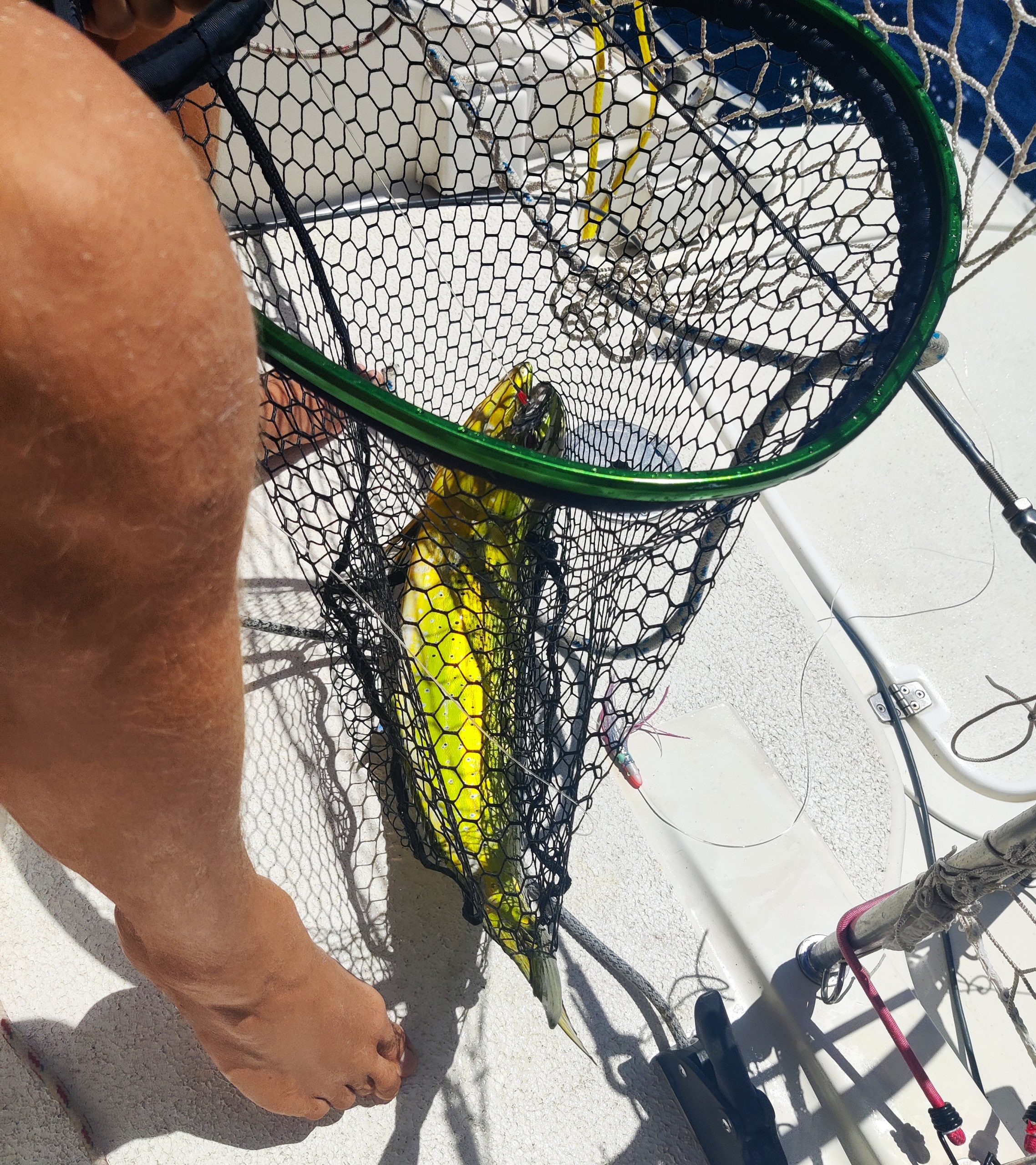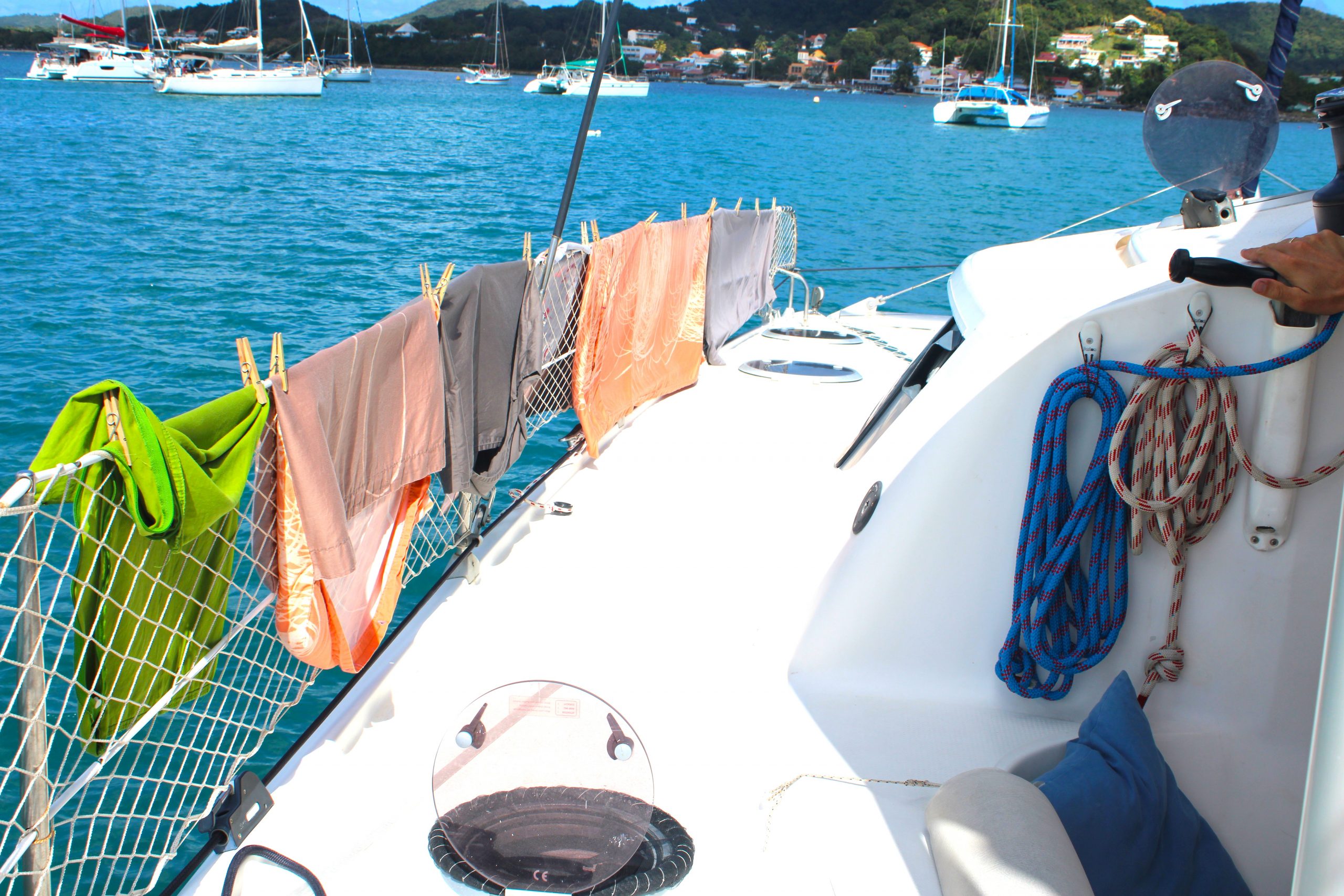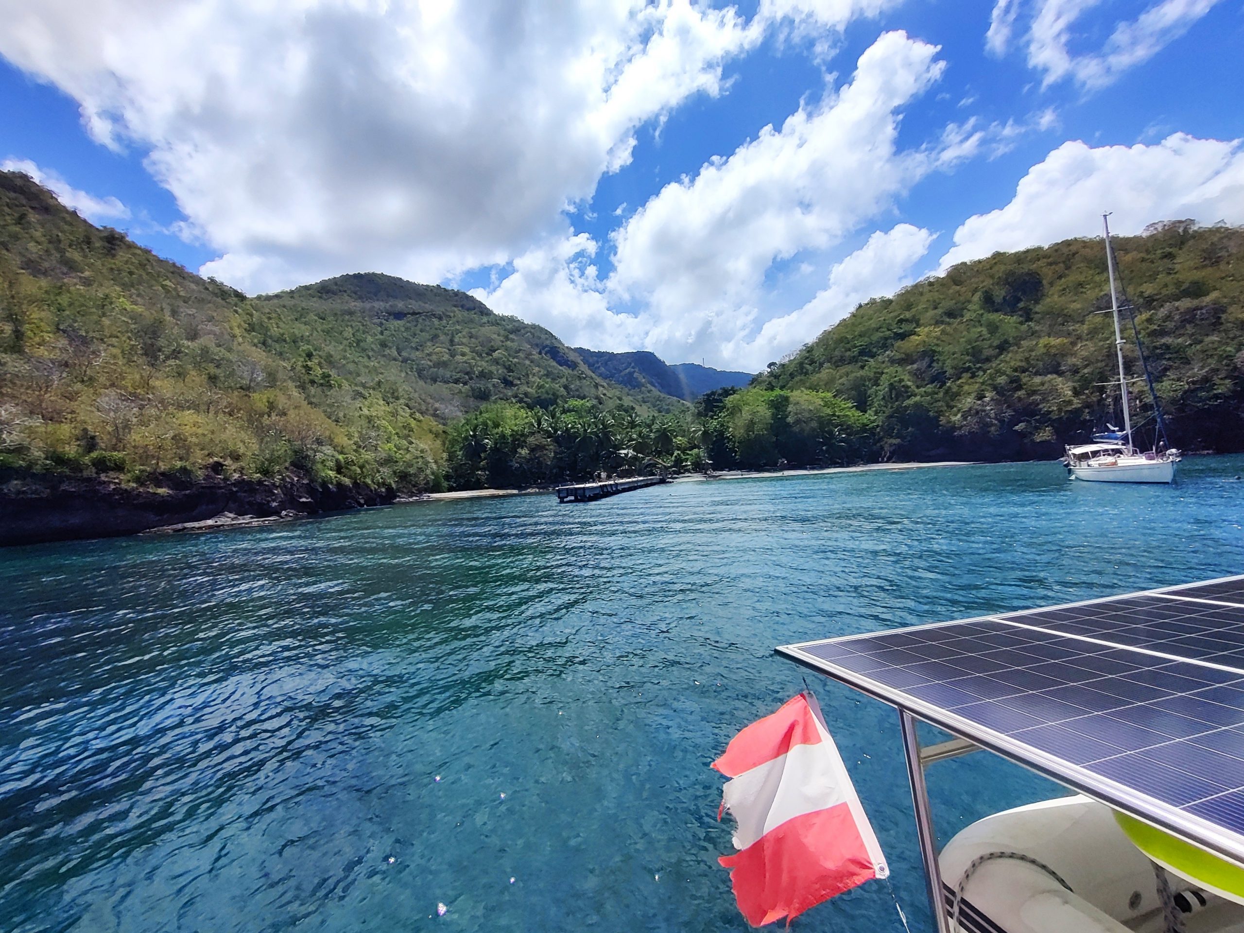 Aber: Das Boot läuft fantastisch. Mit etwa 20 Knoten Wind im Rücken kommen wir auf gute 8 Knoten Fahrt. Das fühlt sich fast schon wie Fliegen an. Als wäre das nicht genug, geht uns unterwegs auch noch ein schöner Mahi Mahi an den Haken. Eine Hälfte fürs Abendessen und die zweite Hälfte wird eingefroren für unsere baldigen Gäste aus Vorarlberg. Gegen Mittag erreichen wir Sainte-Anne im Süden von Martinique und werfen den Anker mit Blick auf Palmen, türkisblaues Wasser und das bunte Treiben an Land. Ein perfekter Empfang – und der Beginn eines besonderen Inselaufenthalts.😀