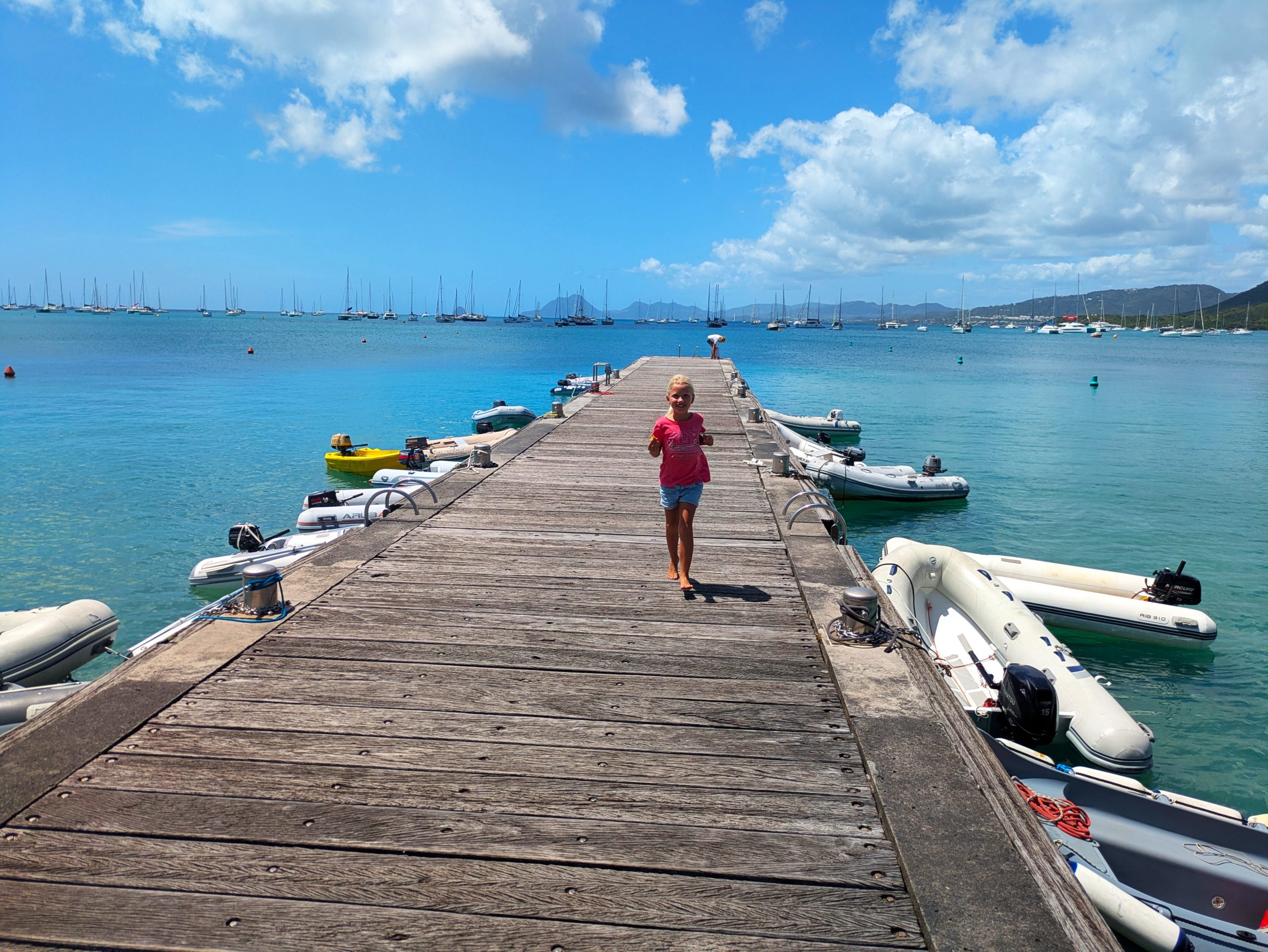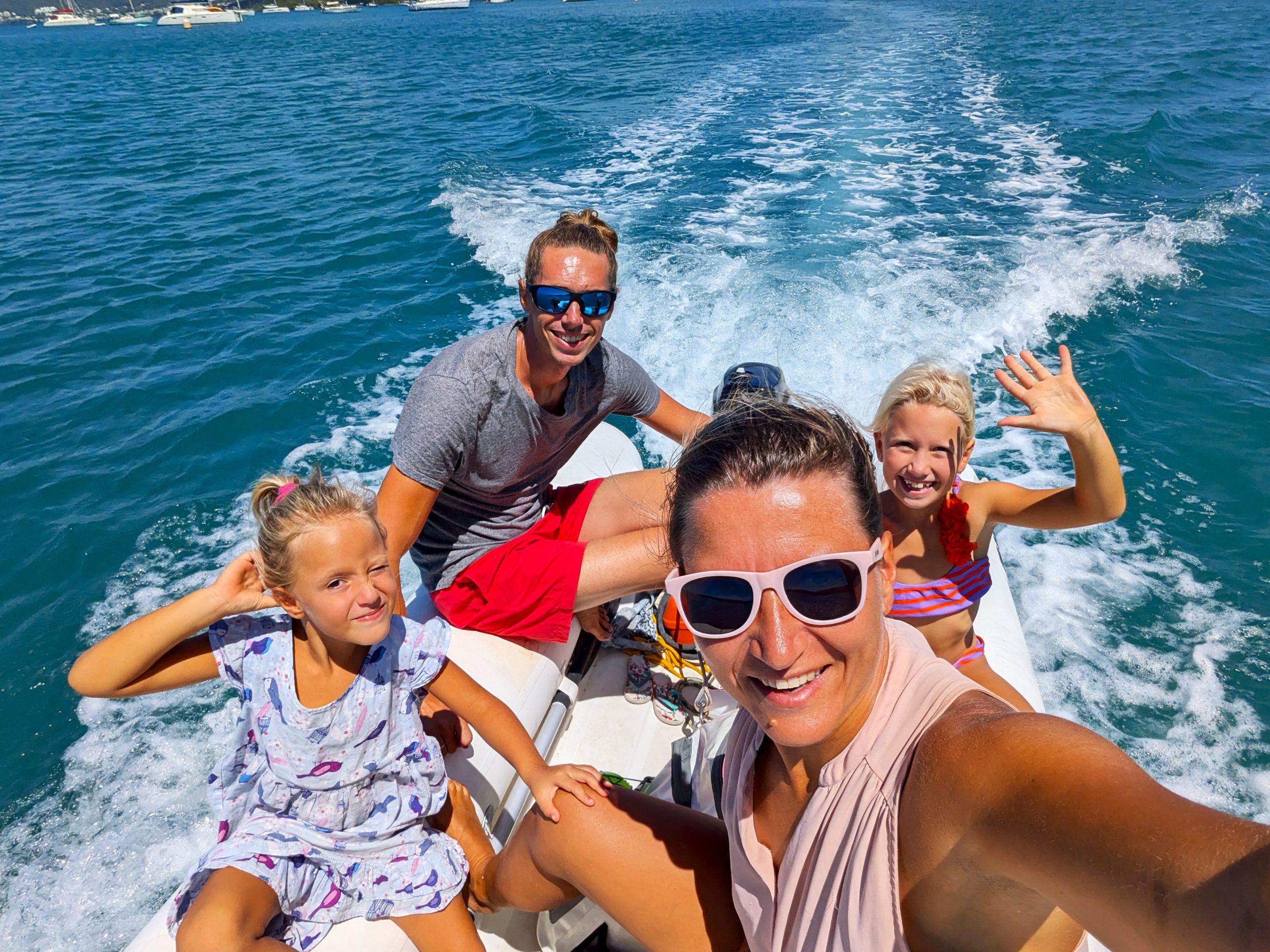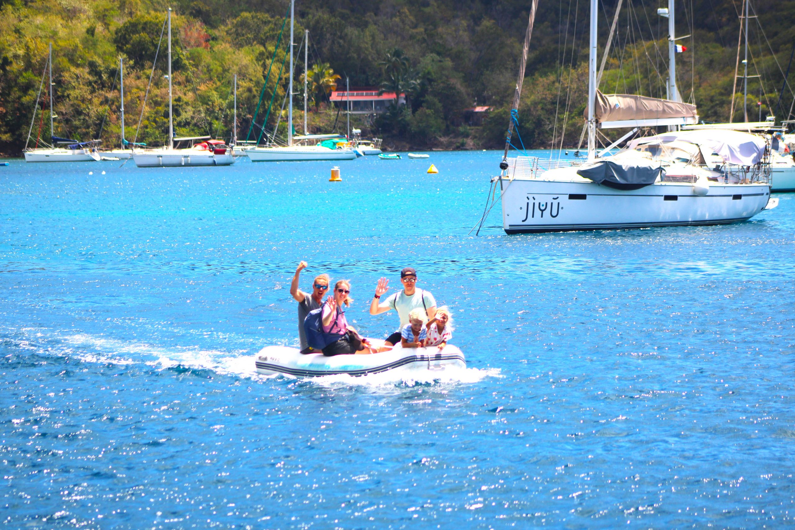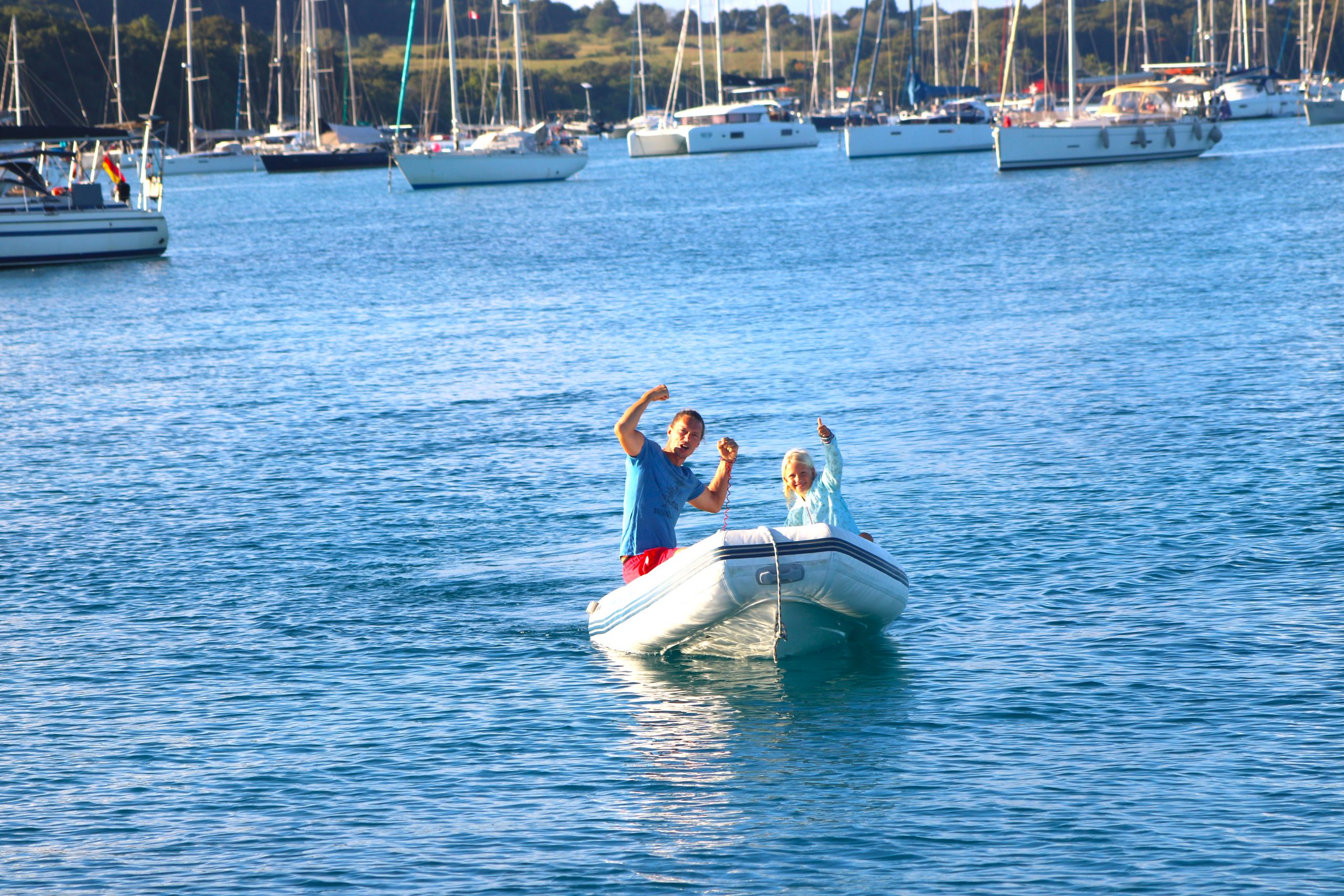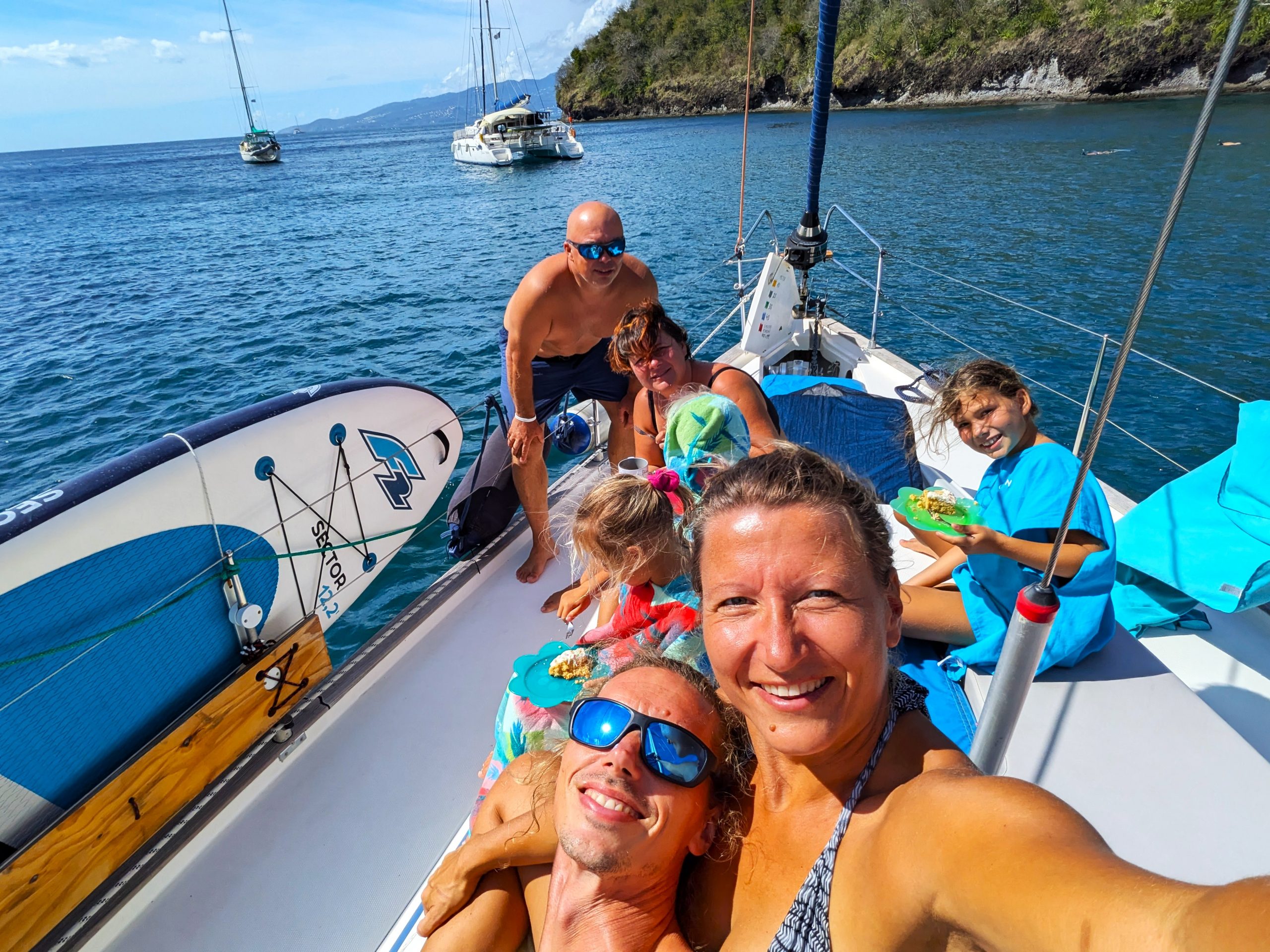 Die Ankerbucht von Sainte-Anne selbst war wie ein schwimmendes Dorf.  Hunderte Segelboote, viele Familien, Kinder in Dinghys, Kinder auf Paddleboards, Kinder überall. Unsere Mädels waren mittendrin. Besonders schön: Sie wurden von einer neuen Freundin – per Dinghy – zum Spielen auf ein Nachbarboot abgeholt. Echte Yacht-Kids eben. Mit zwei befreundeten Familien machten wir später noch den Wasserpark unsicher. Hoch fliegende Kinder, quietschende Gummireifen, Eltern mit aufgerissenen Augen. Und dann: Jakob auf dem Wakeboard – zum ersten Mal. Es sah nicht so aus. Souverän und entspannt pflügte er durchs Wasser, als hätte er’s heimlich geübt. Unser Freund fragte zweimal: „Wirklich das erste Mal?“ 😃