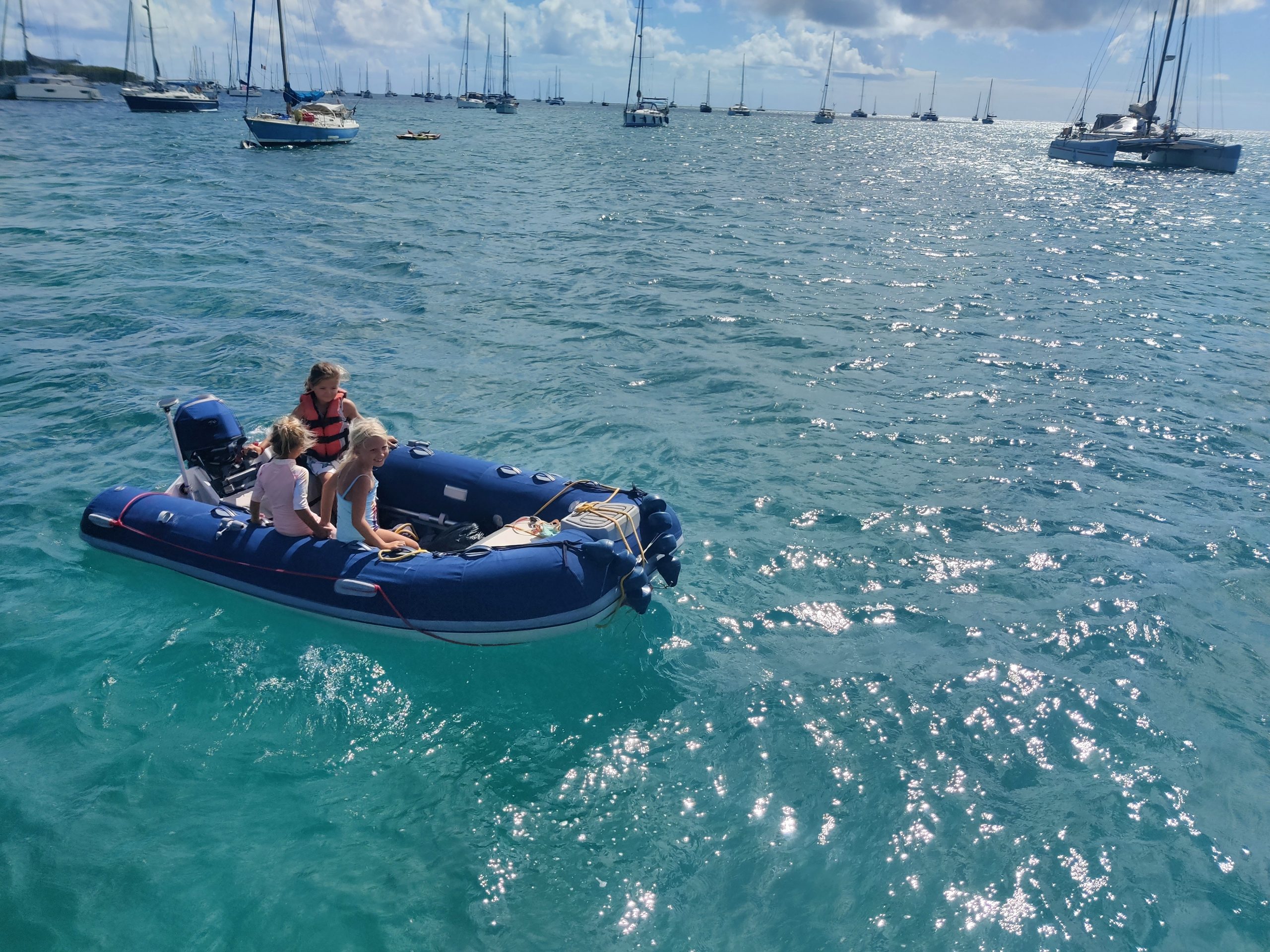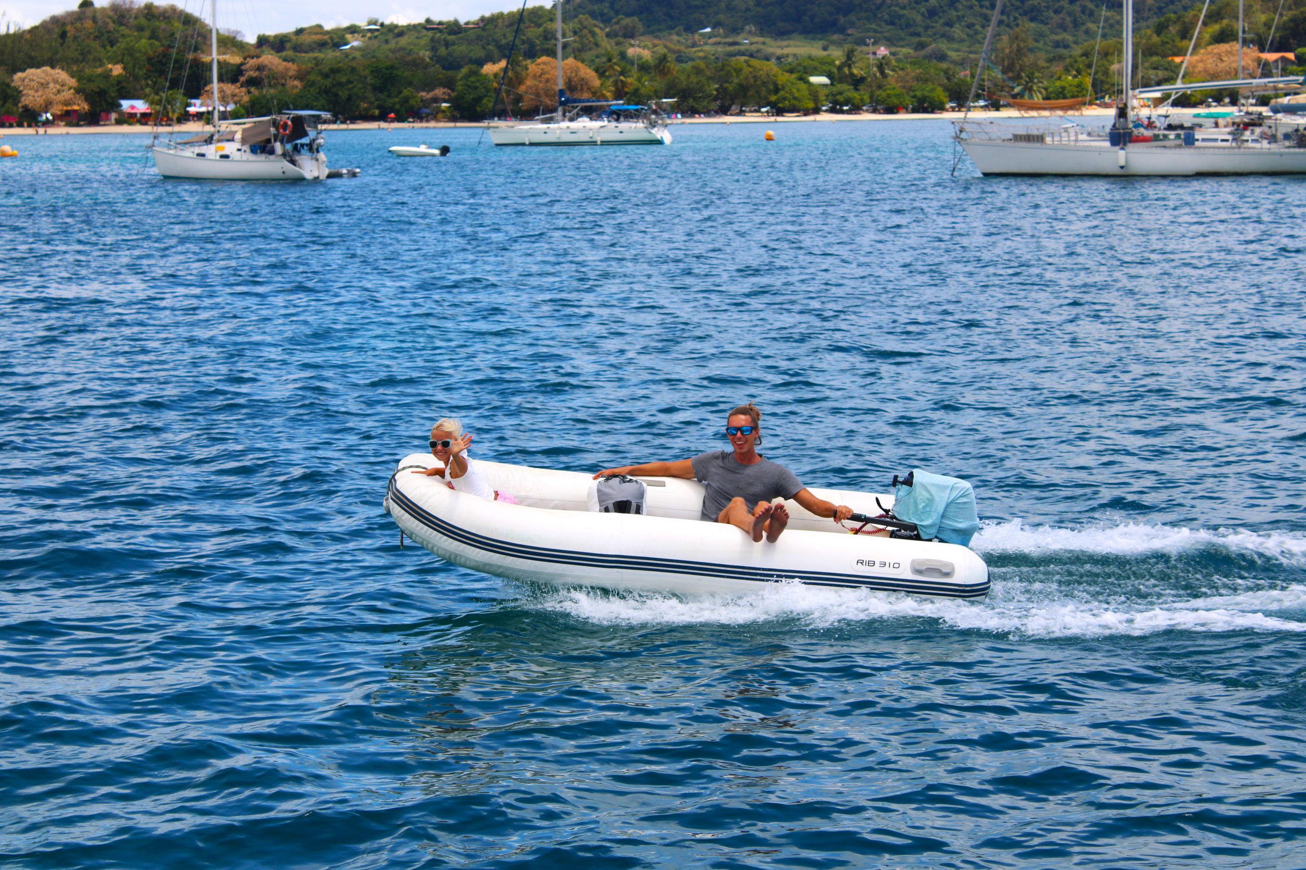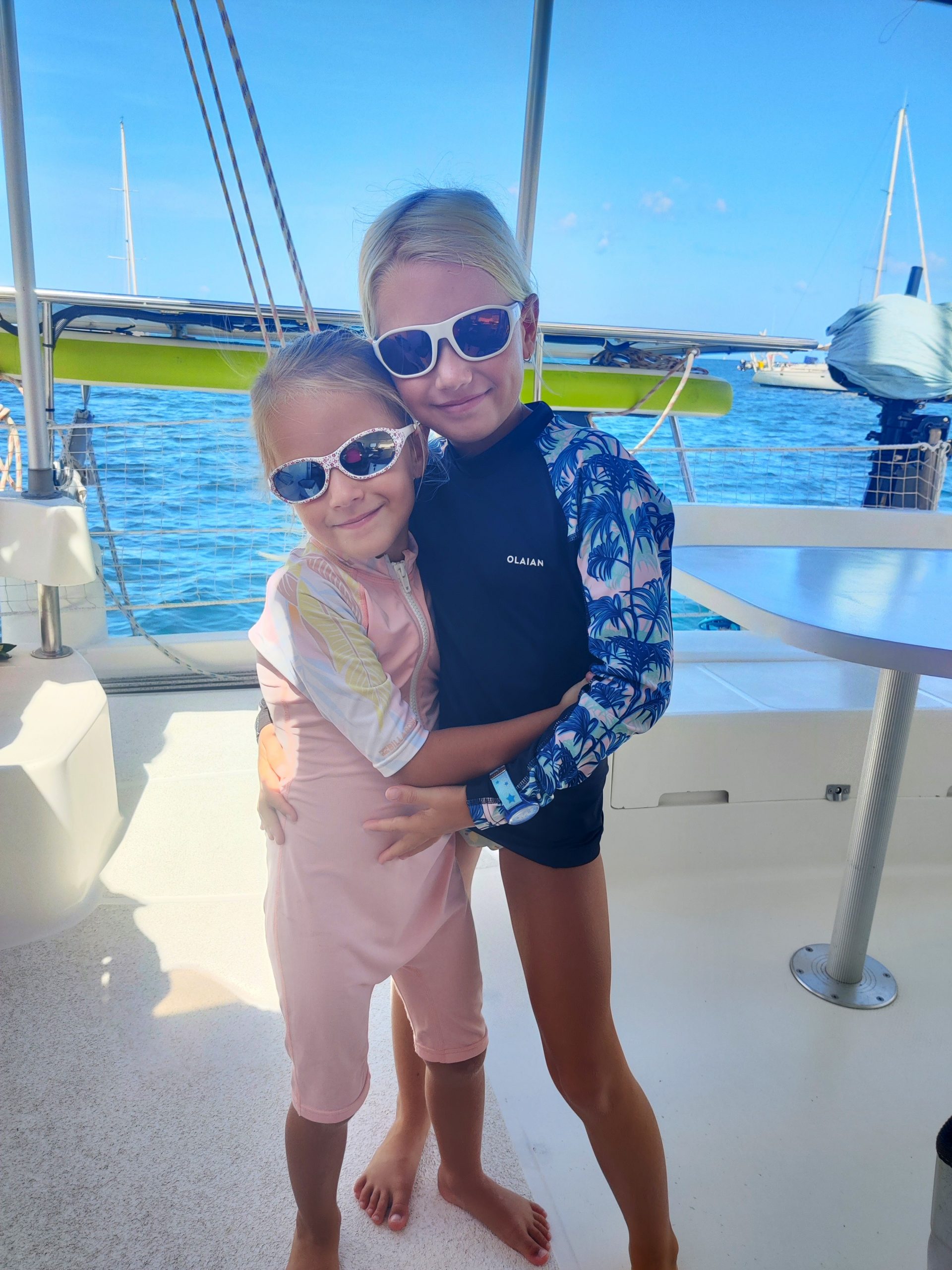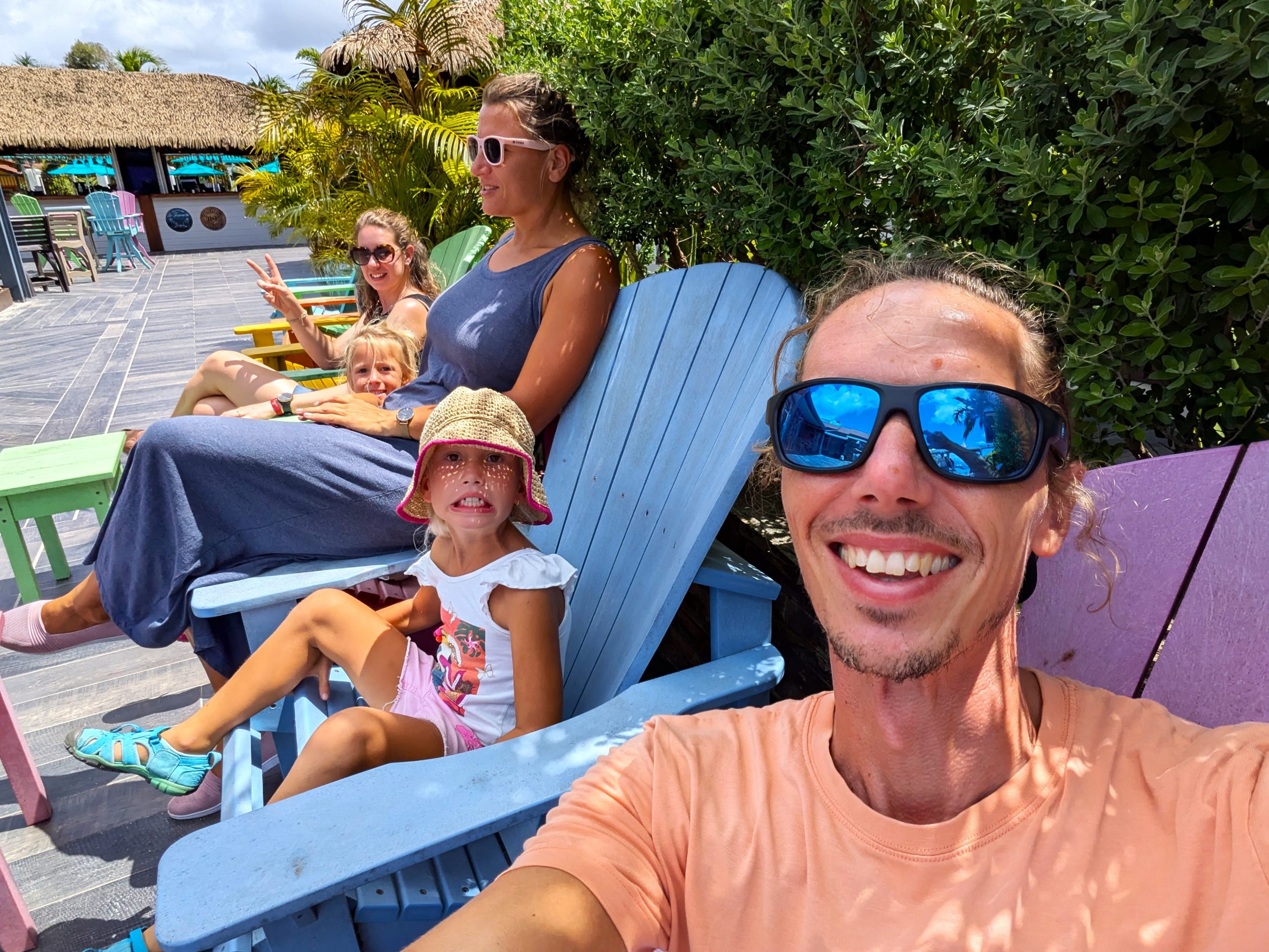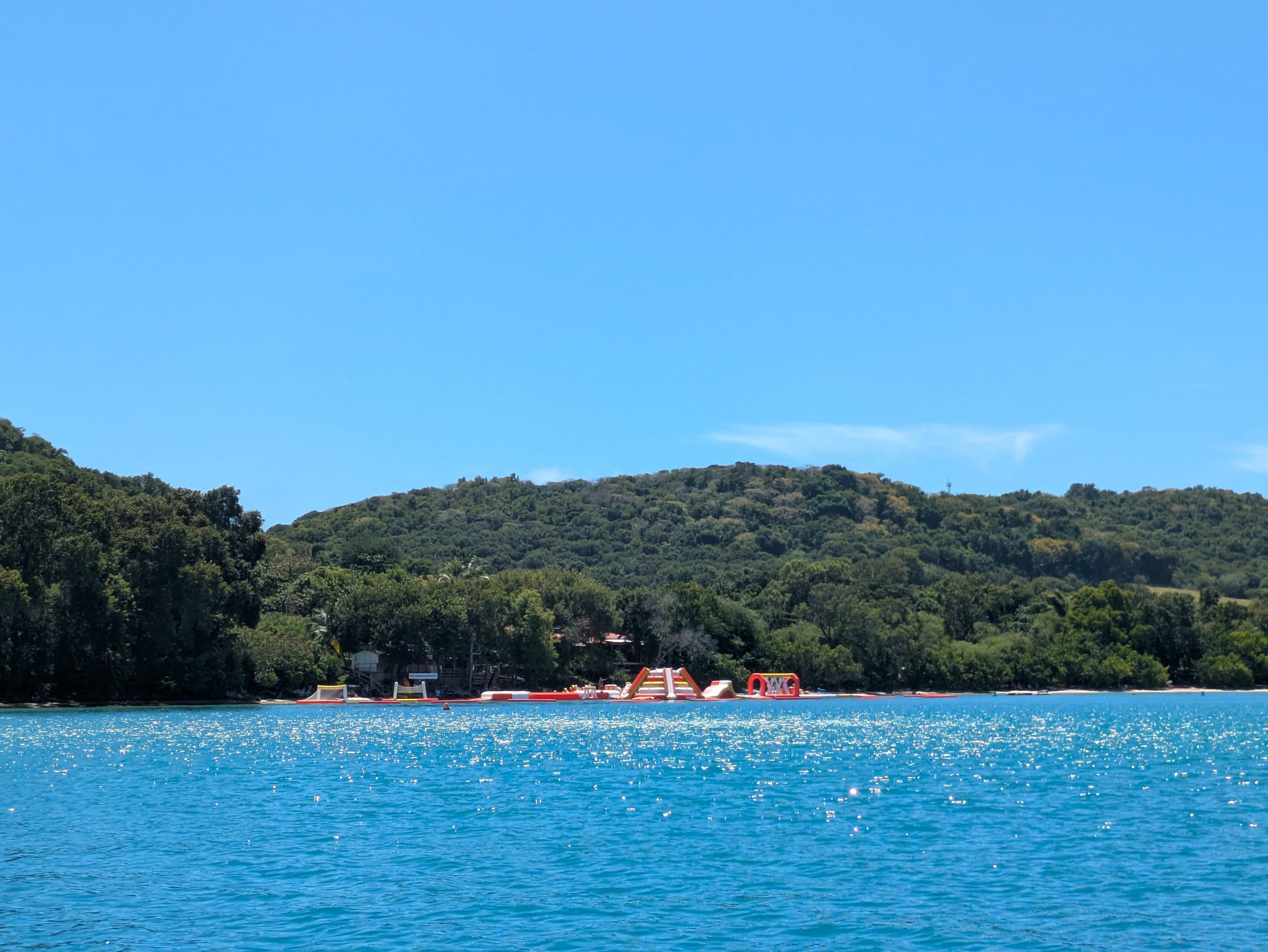 Die Ankerbucht von Sainte-Anne selbst war wie ein schwimmendes Dorf.  Hunderte Segelboote, viele Familien, Kinder in Dinghys, Kinder auf Paddleboards, Kinder überall. Unsere Mädels waren mittendrin. Besonders schön: Sie wurden von einer neuen Freundin – per Dinghy – zum Spielen auf ein Nachbarboot abgeholt. Echte Yacht-Kids eben. Mit zwei befreundeten Familien machten wir später noch den Wasserpark unsicher. Hoch fliegende Kinder, quietschende Gummireifen, Eltern mit aufgerissenen Augen. Und dann: Jakob auf dem Wakeboard – zum ersten Mal. Es sah nicht so aus. Souverän und entspannt pflügte er durchs Wasser, als hätte er’s heimlich geübt. Unser Freund fragte zweimal: „Wirklich das erste Mal?“ 😃