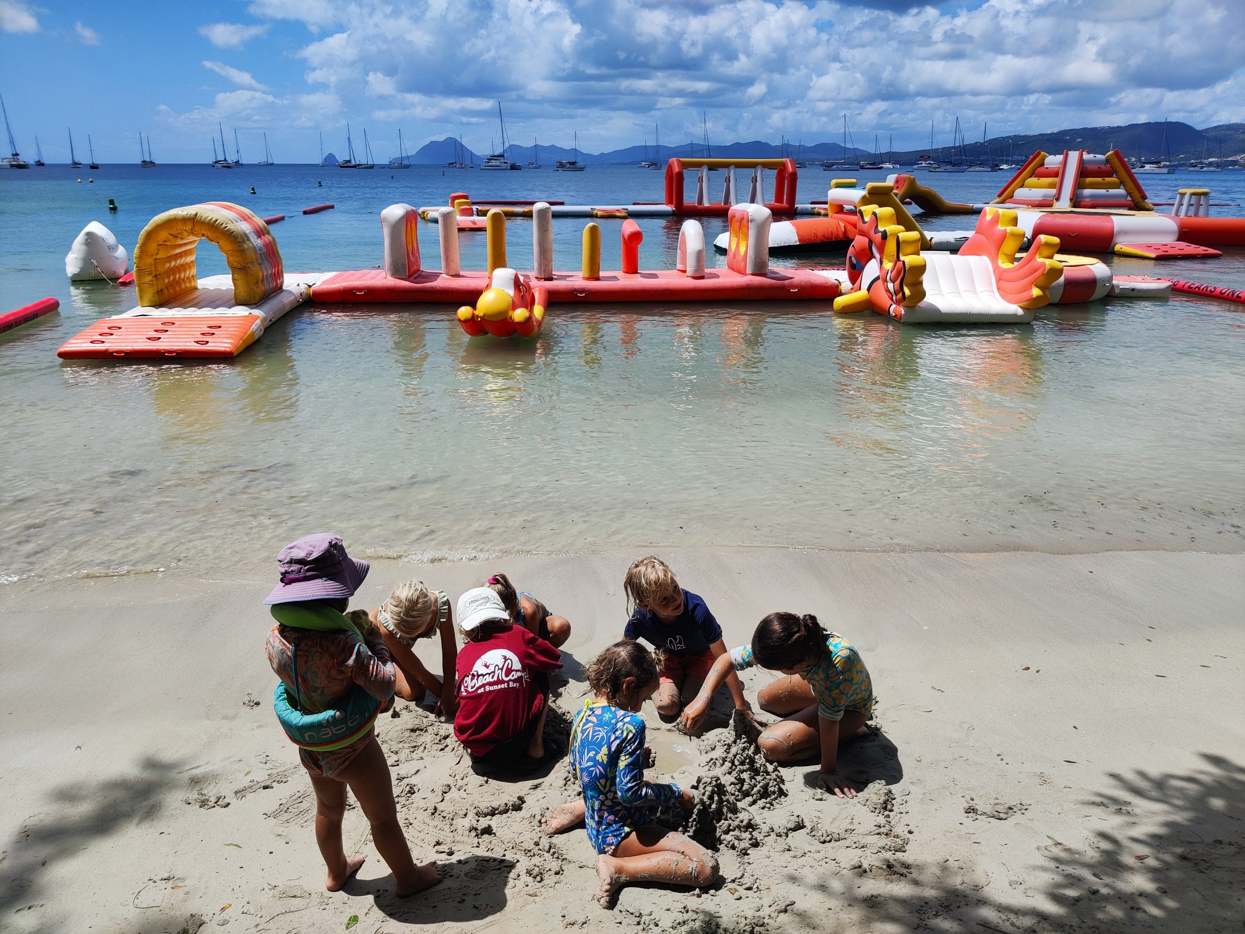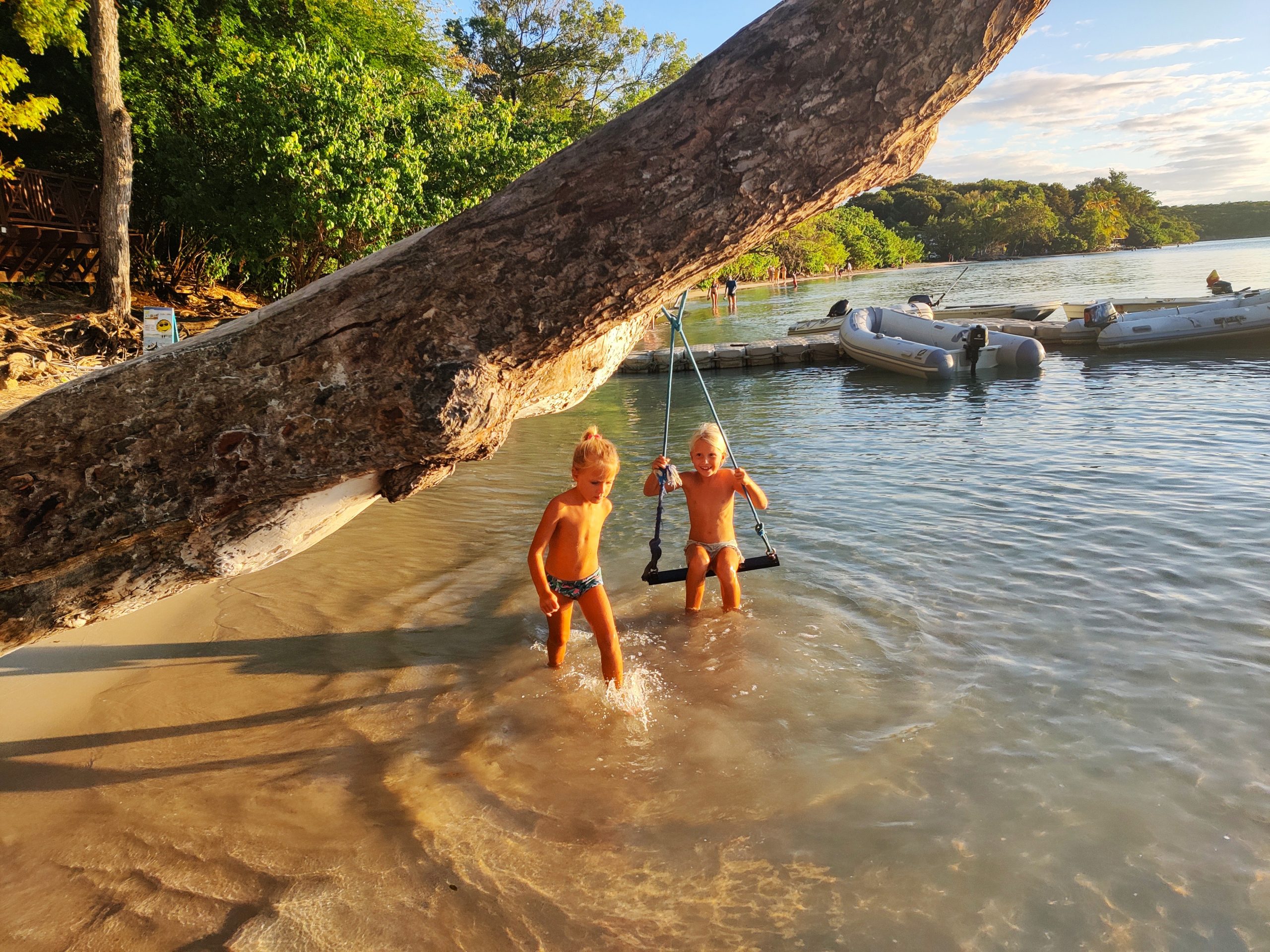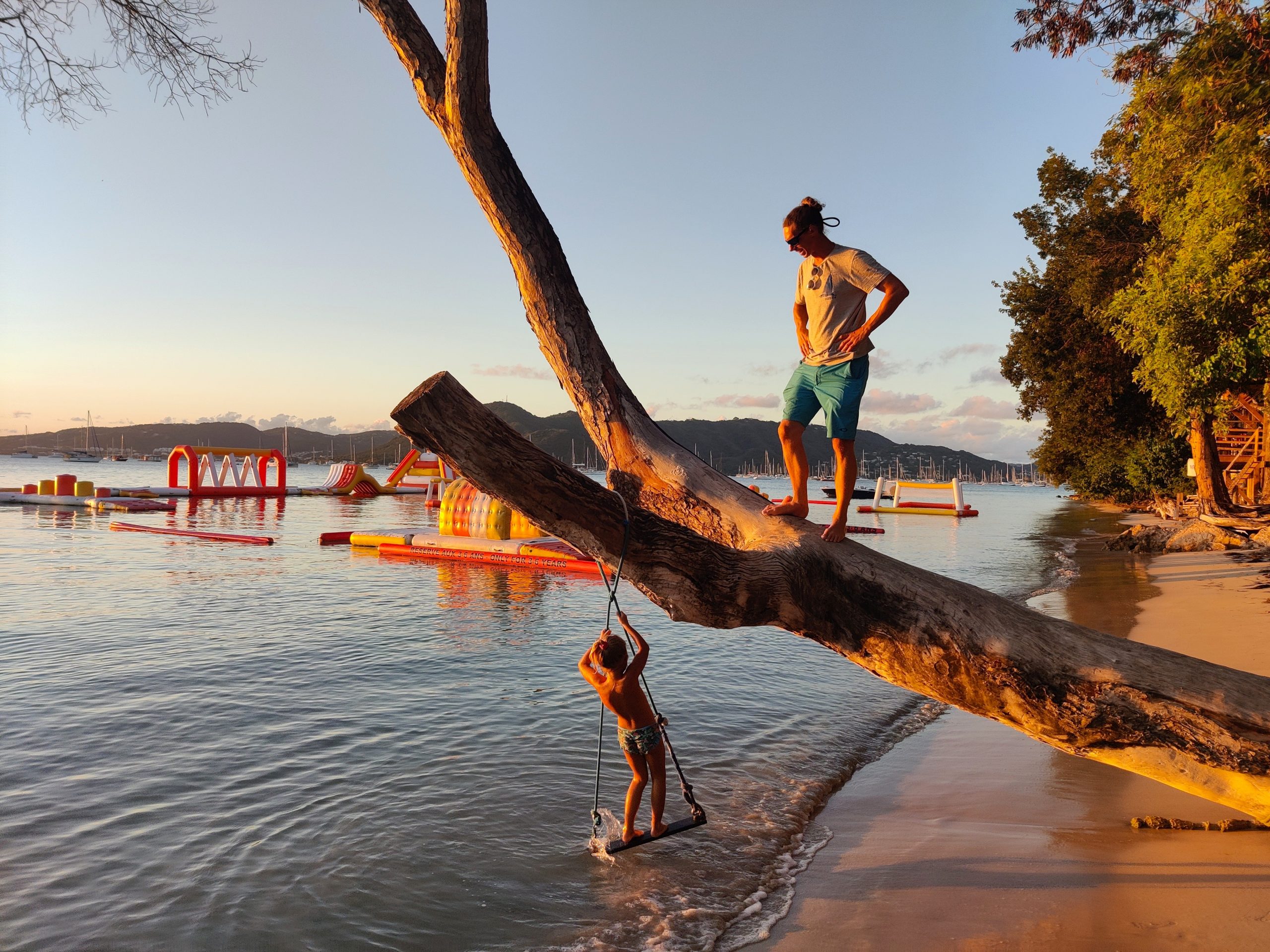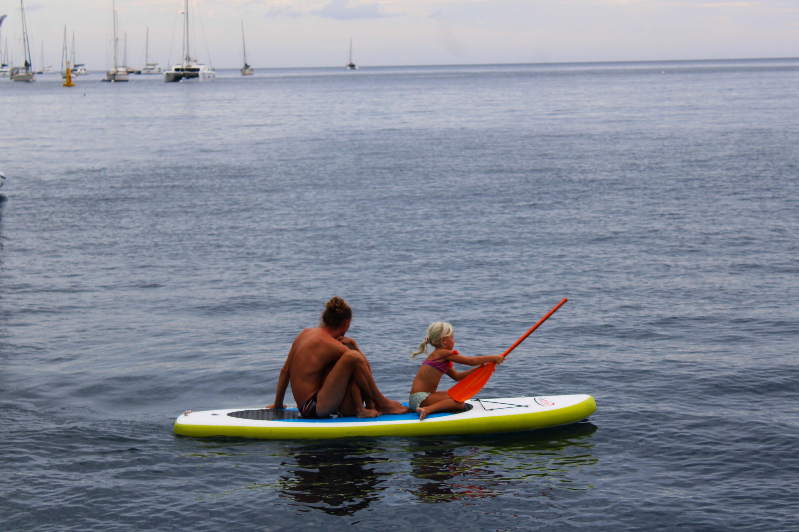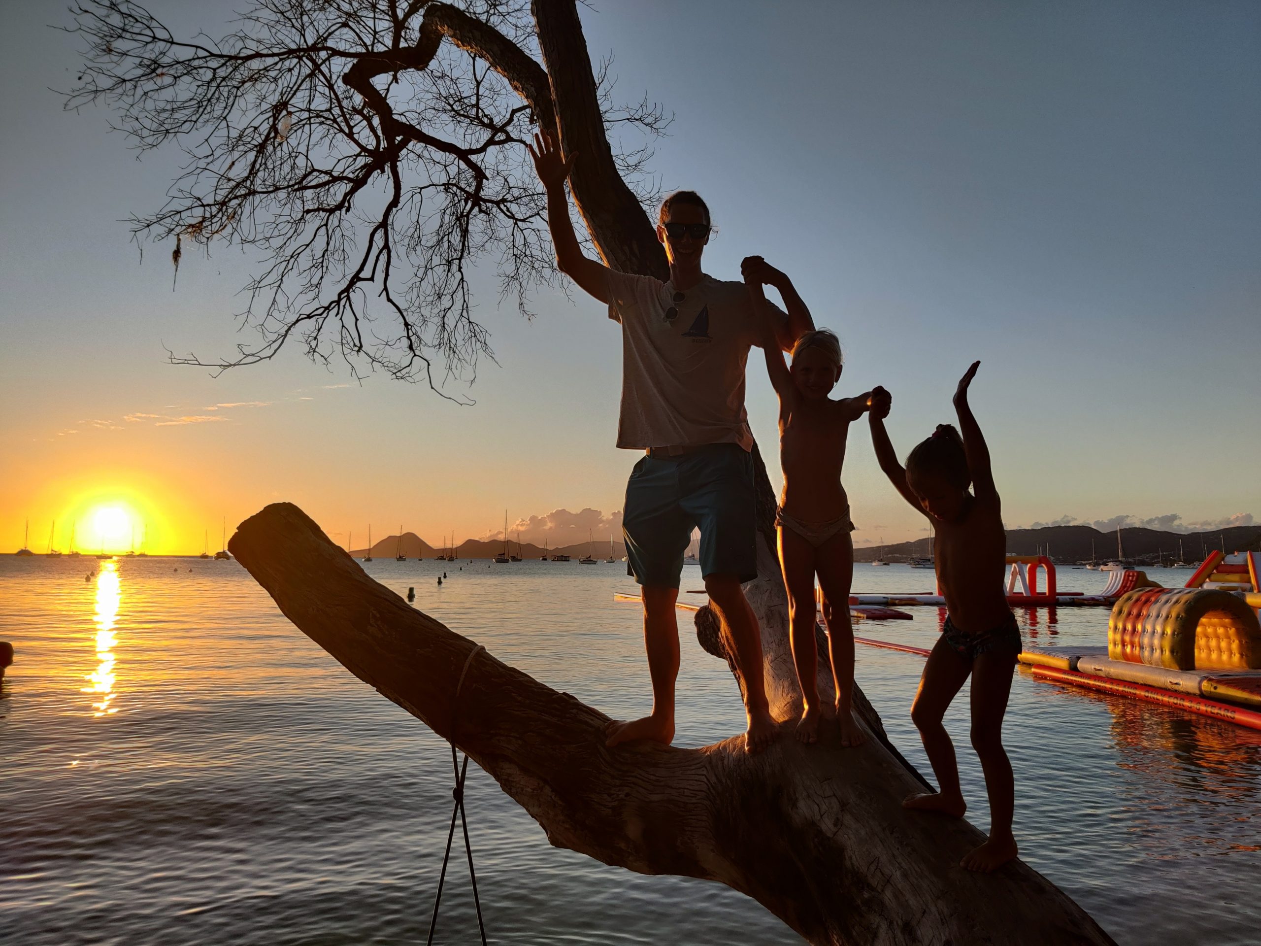 Die Ankerbucht von Sainte-Anne selbst war wie ein schwimmendes Dorf.  Hunderte Segelboote, viele Familien, Kinder in Dinghys, Kinder auf Paddleboards, Kinder überall. Unsere Mädels waren mittendrin. Besonders schön: Sie wurden von einer neuen Freundin – per Dinghy – zum Spielen auf ein Nachbarboot abgeholt. Echte Yacht-Kids eben. Mit zwei befreundeten Familien machten wir später noch den Wasserpark unsicher. Hoch fliegende Kinder, quietschende Gummireifen, Eltern mit aufgerissenen Augen. Und dann: Jakob auf dem Wakeboard – zum ersten Mal. Es sah nicht so aus. Souverän und entspannt pflügte er durchs Wasser, als hätte er’s heimlich geübt. Unser Freund fragte zweimal: „Wirklich das erste Mal?“ 😃