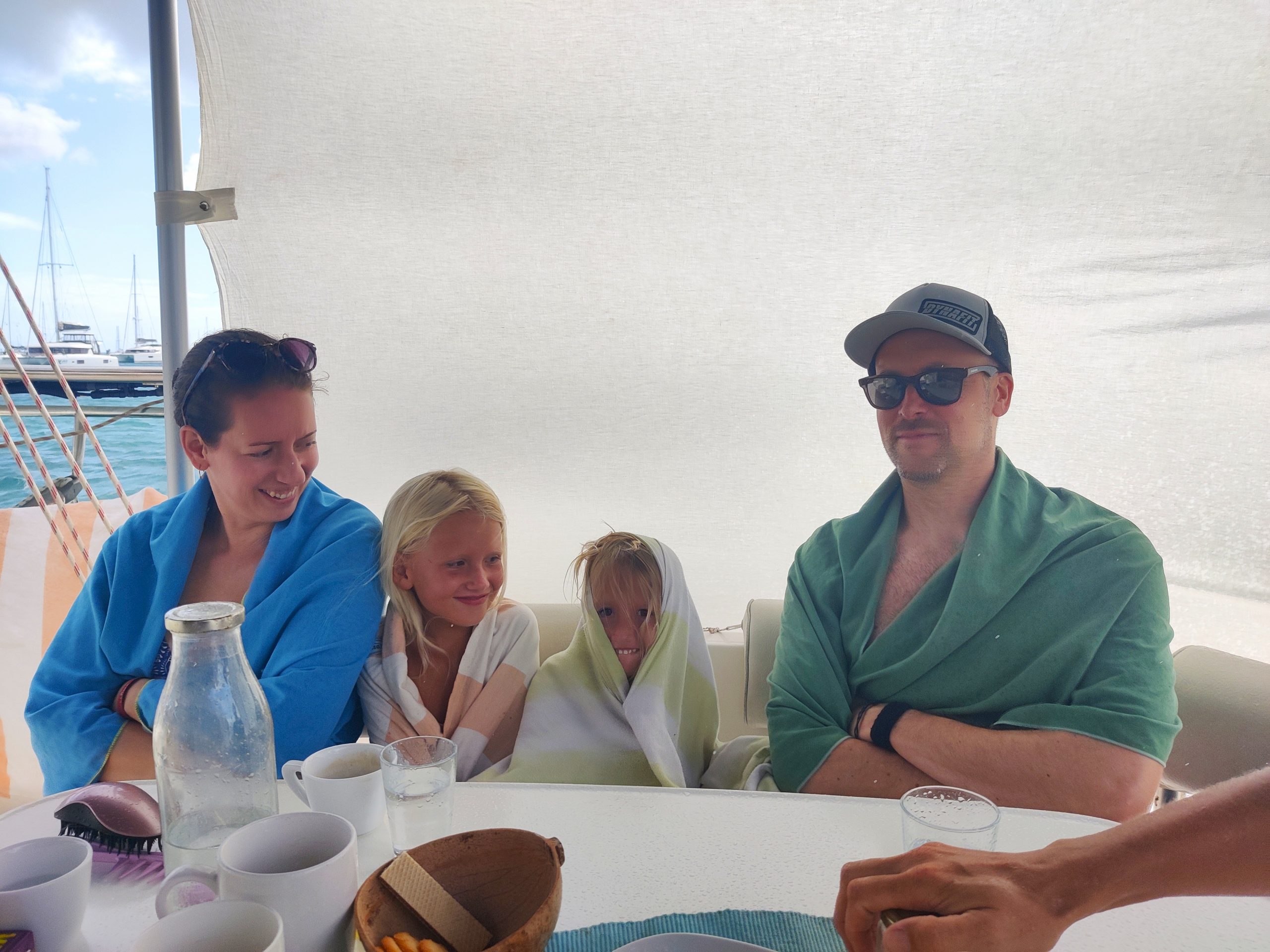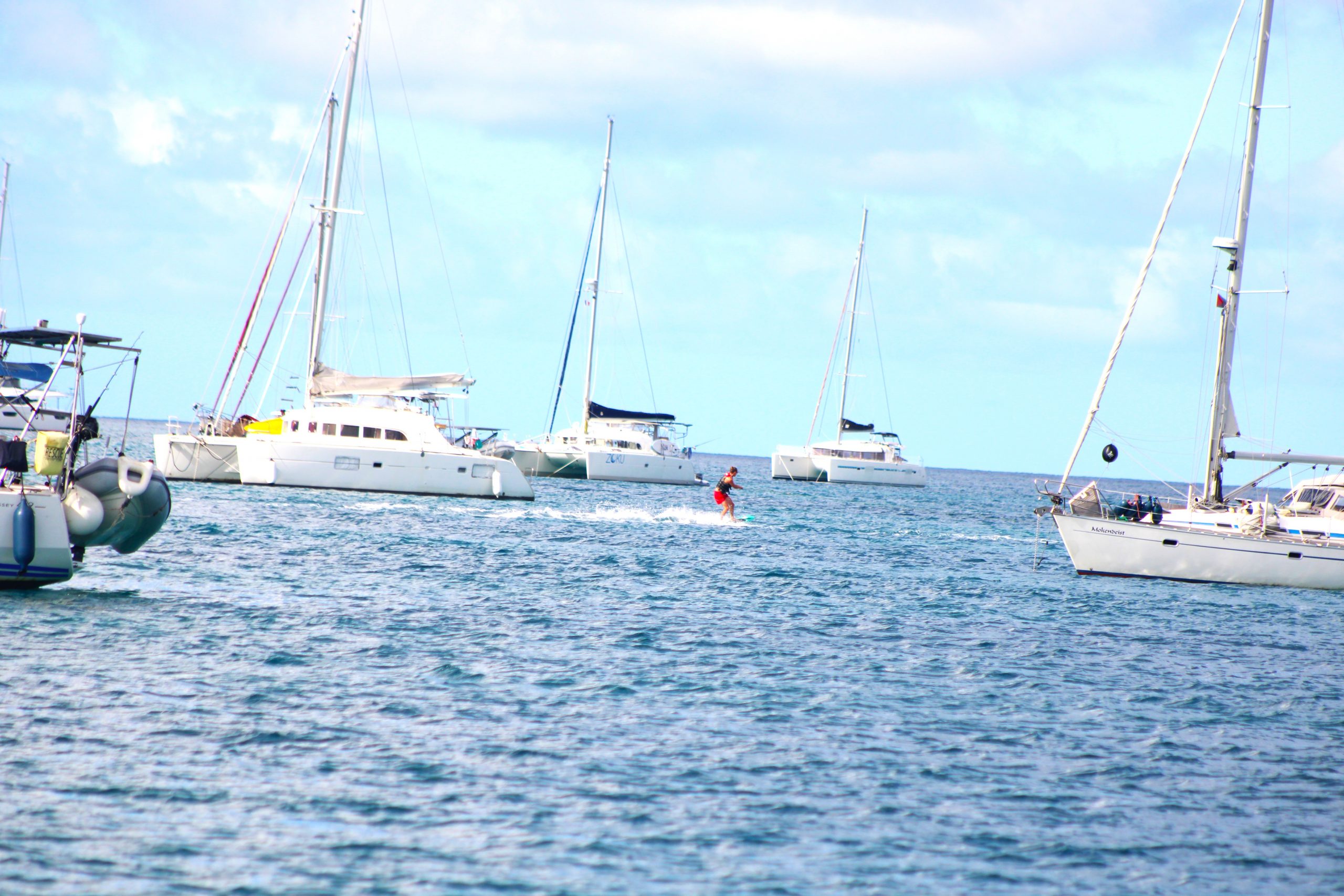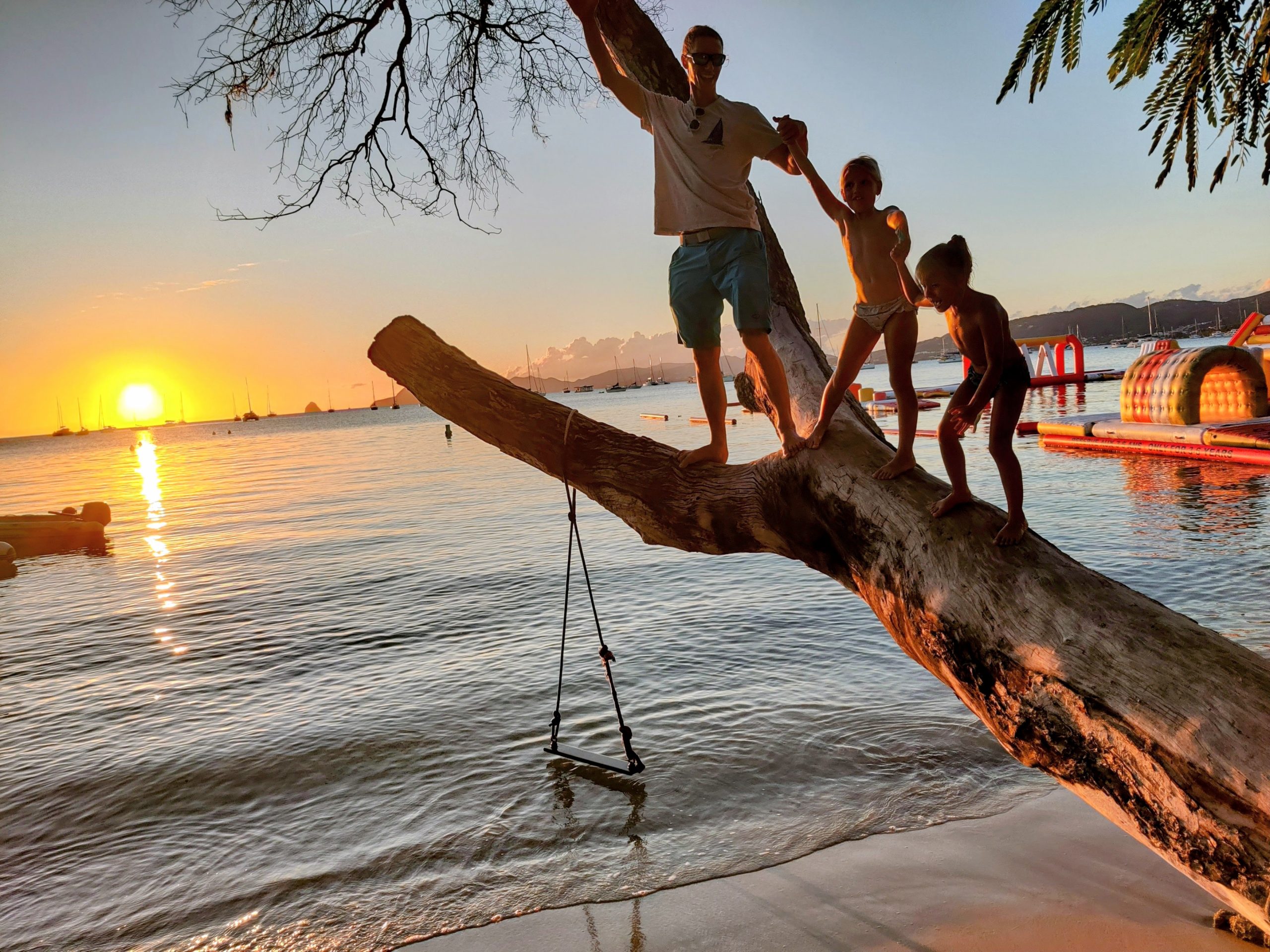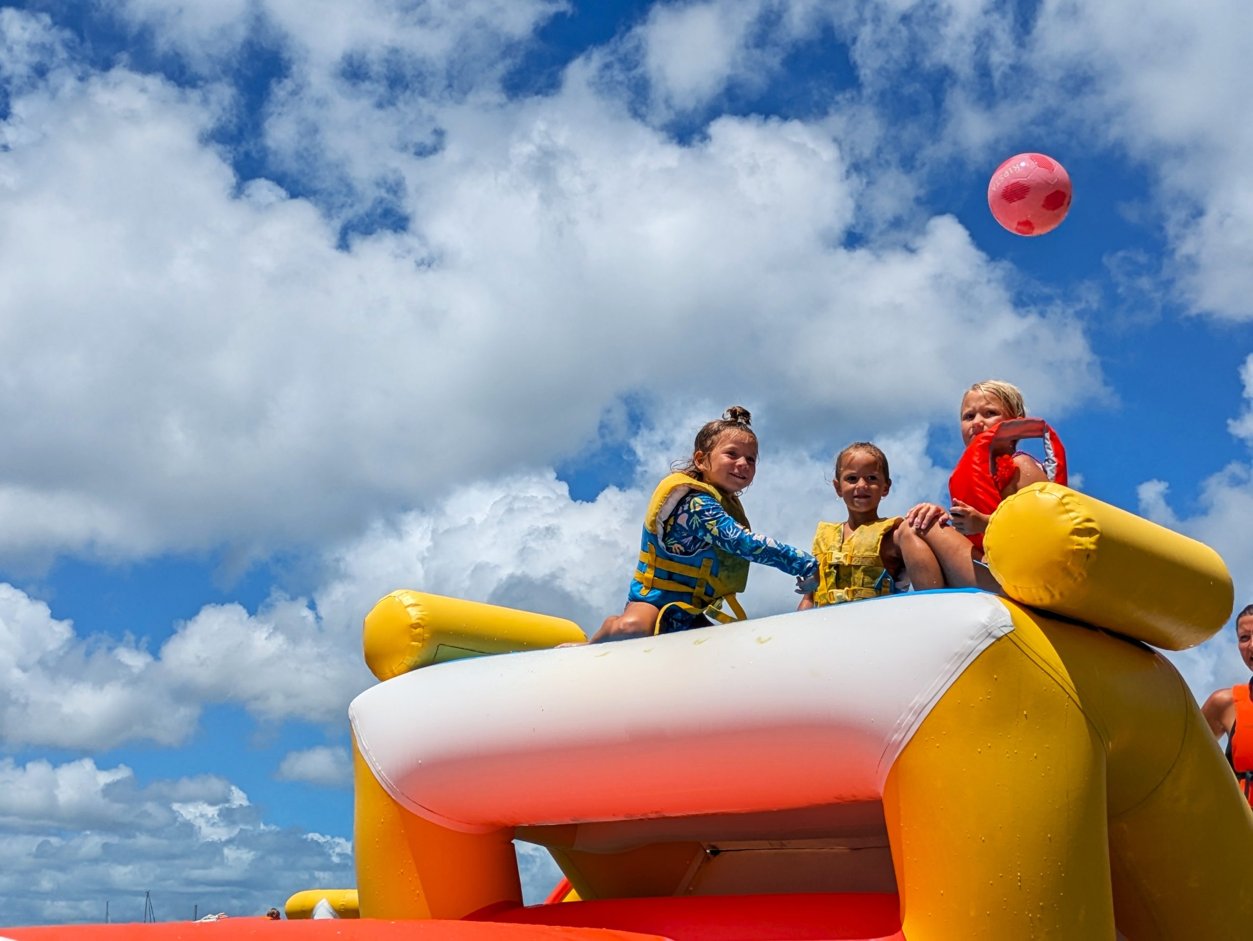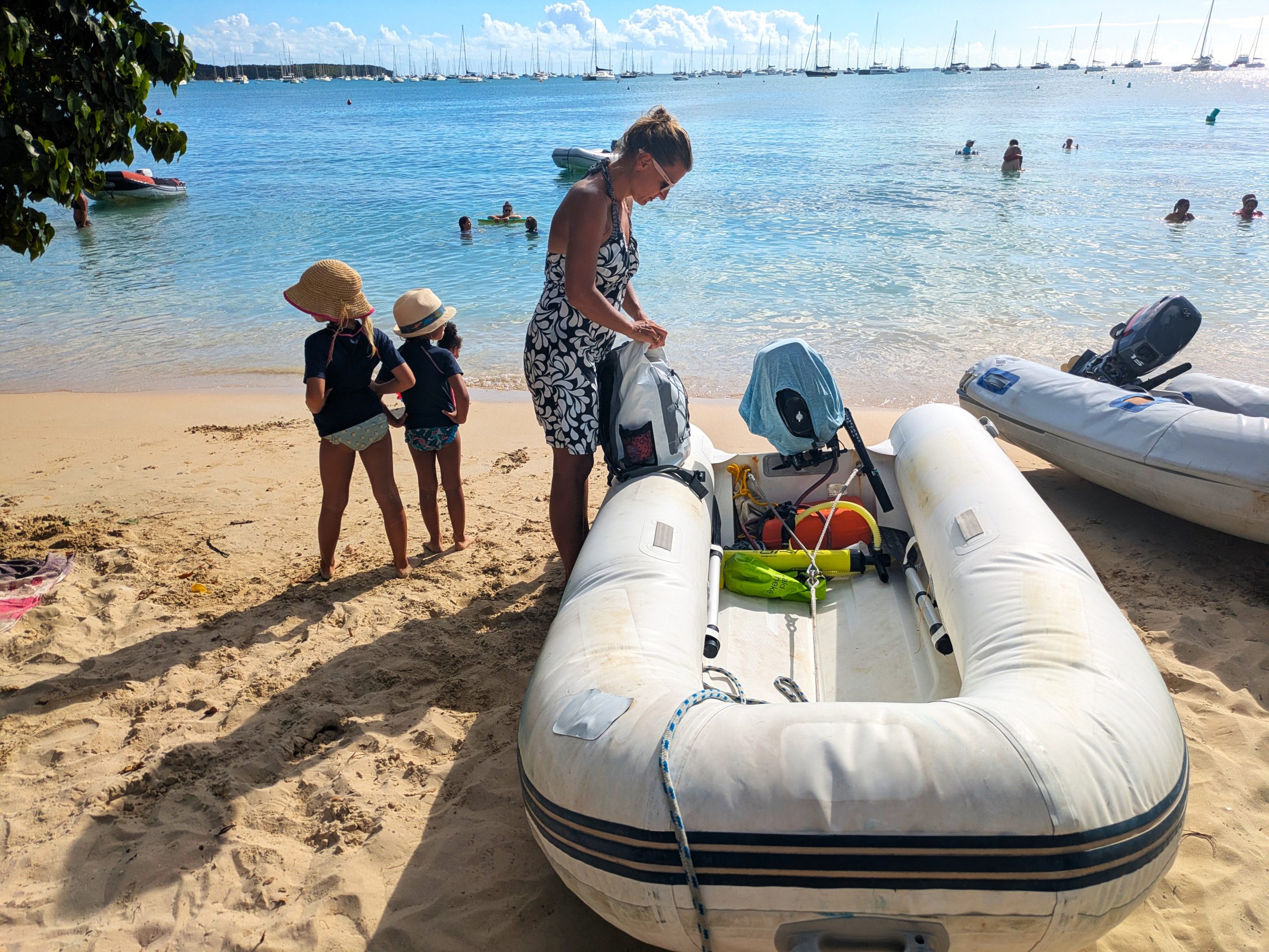Die Ankerbucht von Sainte-Anne selbst war wie ein schwimmendes Dorf.  Hunderte Segelboote, viele Familien, Kinder in Dinghys, Kinder auf Paddleboards, Kinder überall. Unsere Mädels waren mittendrin. Besonders schön: Sie wurden von einer neuen Freundin – per Dinghy – zum Spielen auf ein Nachbarboot abgeholt. Echte Yacht-Kids eben. Mit zwei befreundeten Familien machten wir später noch den Wasserpark unsicher. Hoch fliegende Kinder, quietschende Gummireifen, Eltern mit aufgerissenen Augen. Und dann: Jakob auf dem Wakeboard – zum ersten Mal. Es sah nicht so aus. Souverän und entspannt pflügte er durchs Wasser, als hätte er’s heimlich geübt. Unser Freund fragte zweimal: „Wirklich das erste Mal?“ 😃