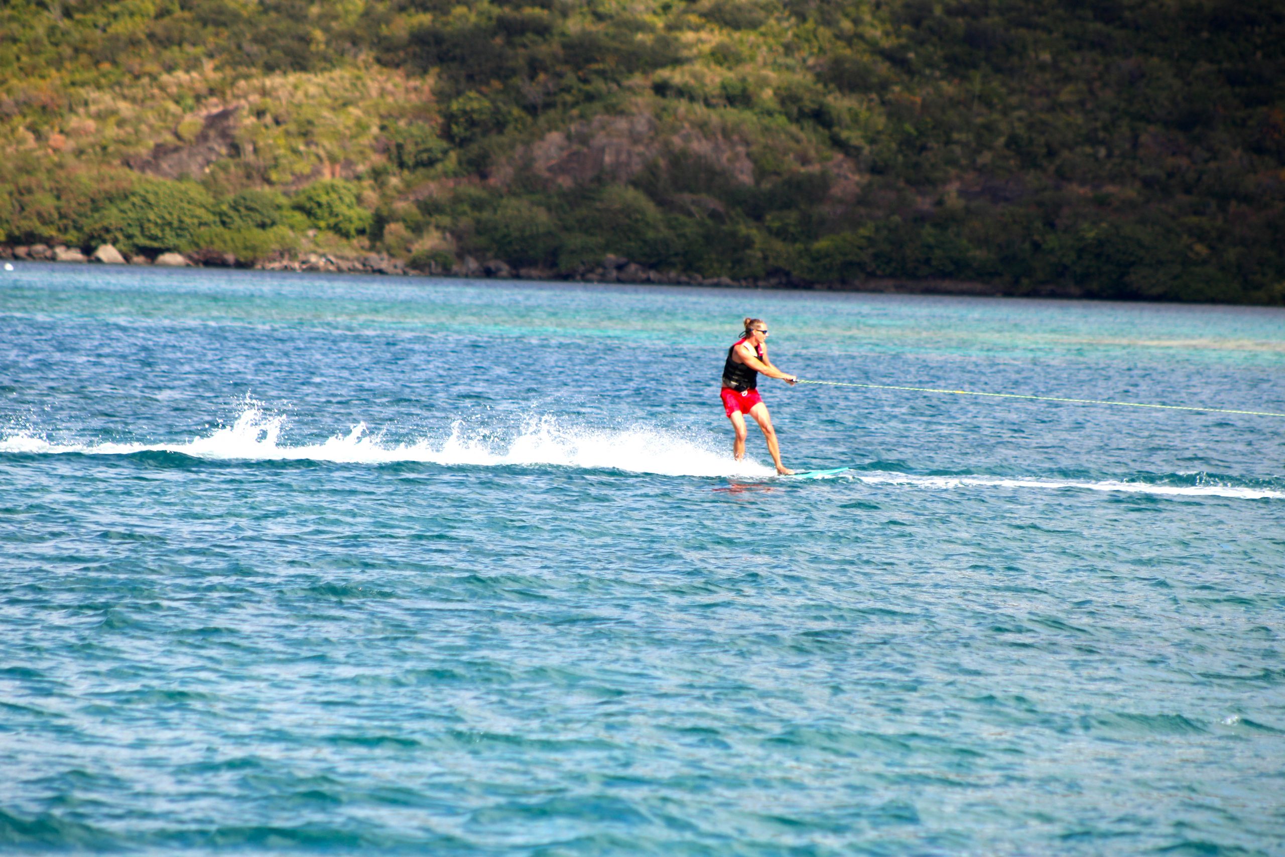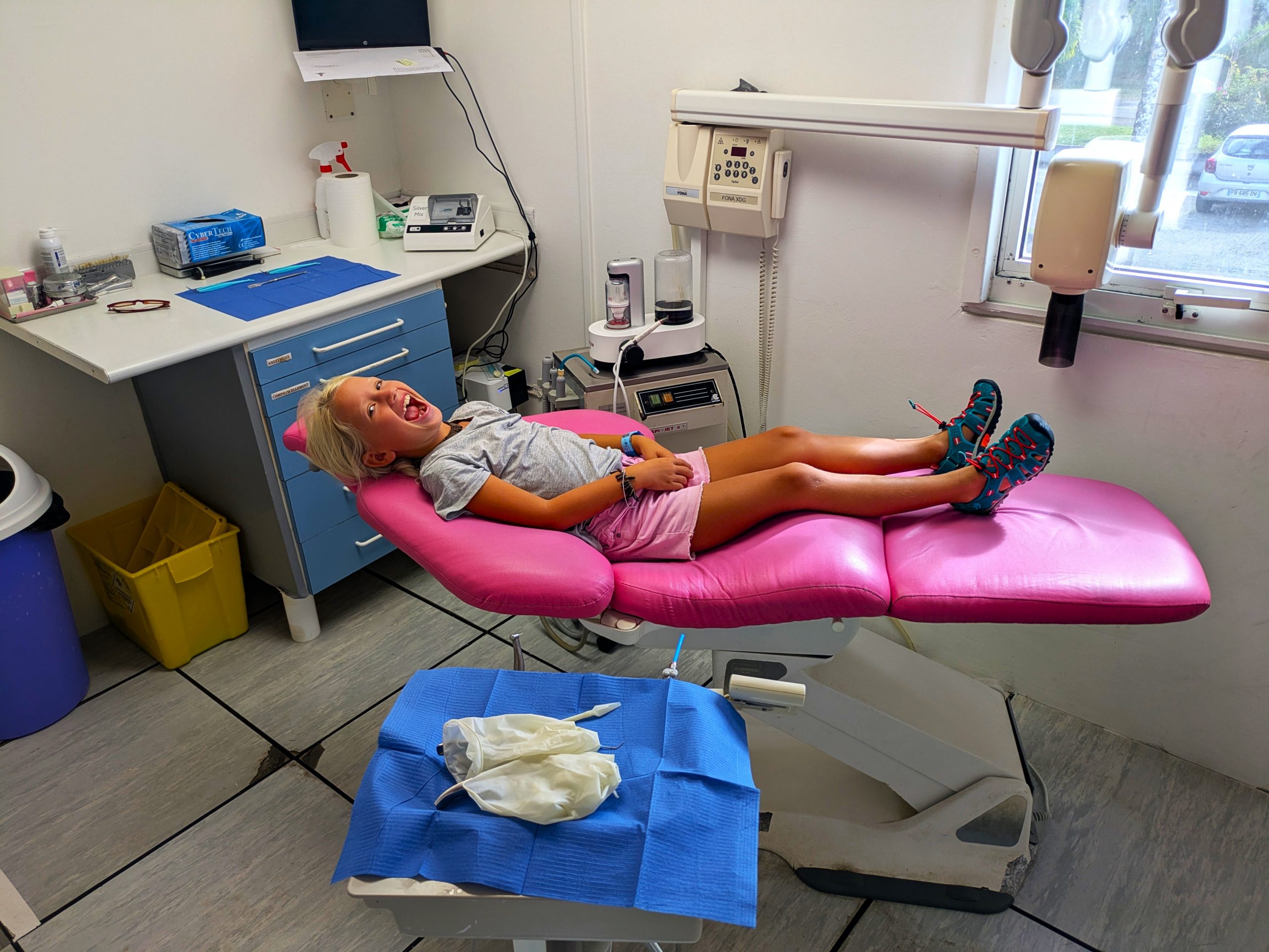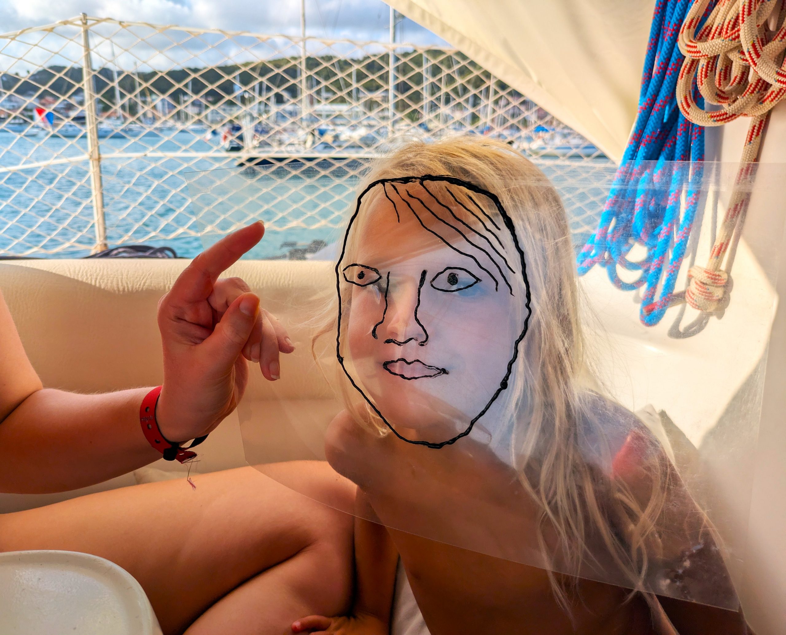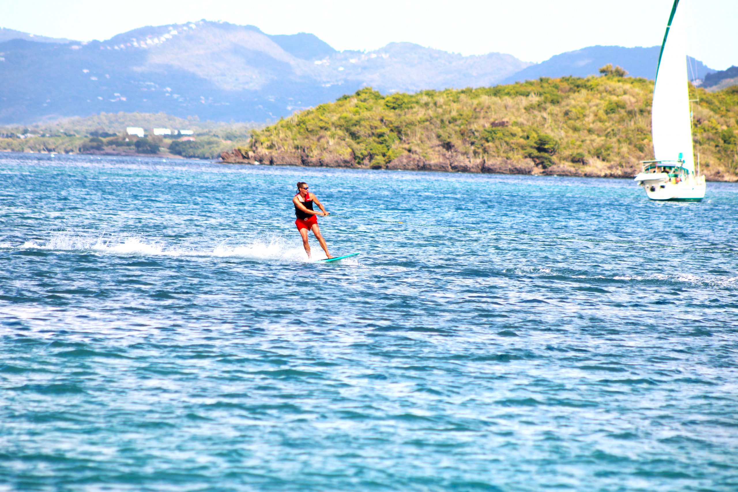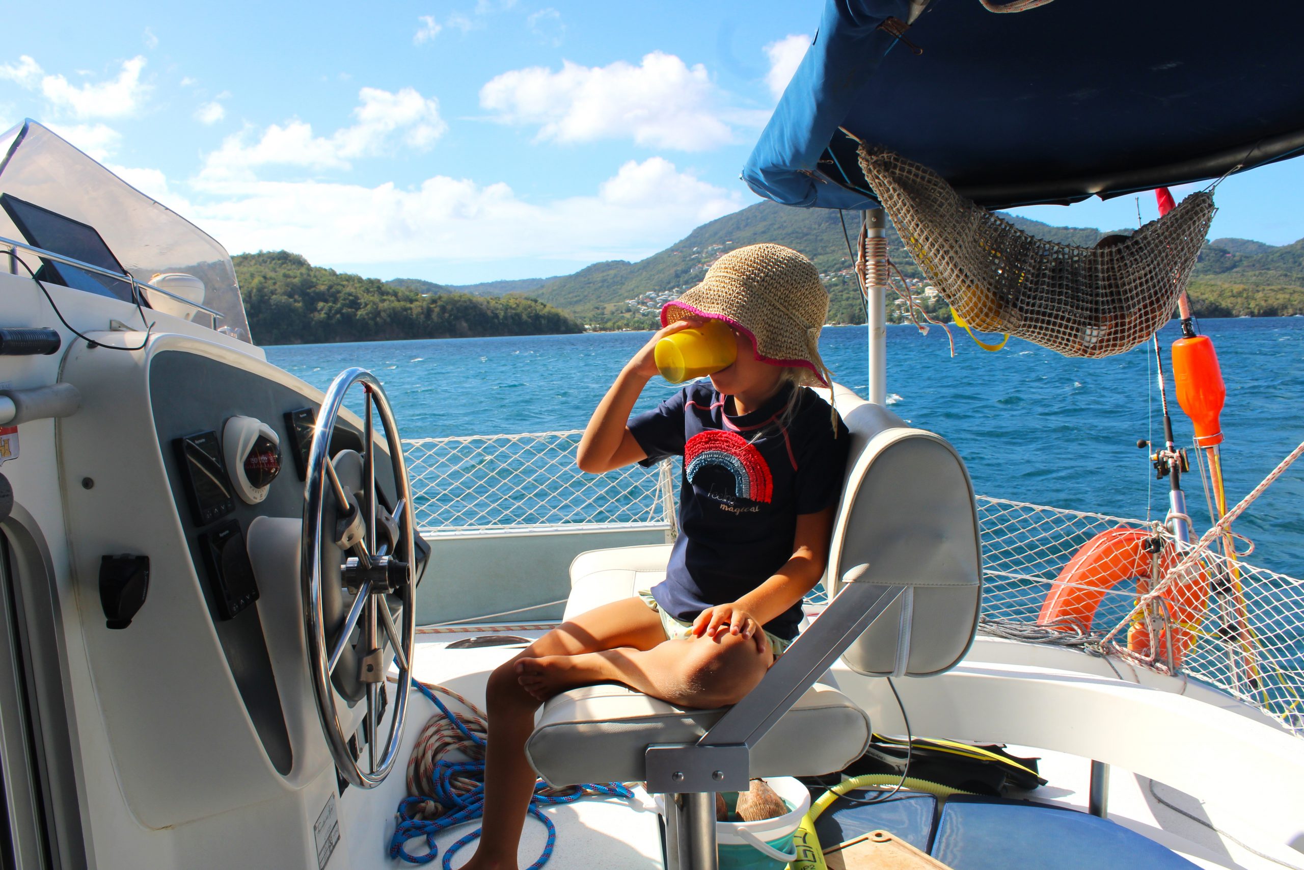 Die Ankerbucht von Sainte-Anne selbst war wie ein schwimmendes Dorf.  Hunderte Segelboote, viele Familien, Kinder in Dinghys, Kinder auf Paddleboards, Kinder überall. Unsere Mädels waren mittendrin. Besonders schön: Sie wurden von einer neuen Freundin – per Dinghy – zum Spielen auf ein Nachbarboot abgeholt. Echte Yacht-Kids eben. Mit zwei befreundeten Familien machten wir später noch den Wasserpark unsicher. Hoch fliegende Kinder, quietschende Gummireifen, Eltern mit aufgerissenen Augen. Und dann: Jakob auf dem Wakeboard – zum ersten Mal. Es sah nicht so aus. Souverän und entspannt pflügte er durchs Wasser, als hätte er’s heimlich geübt. Unser Freund fragte zweimal: „Wirklich das erste Mal?“ 😃
