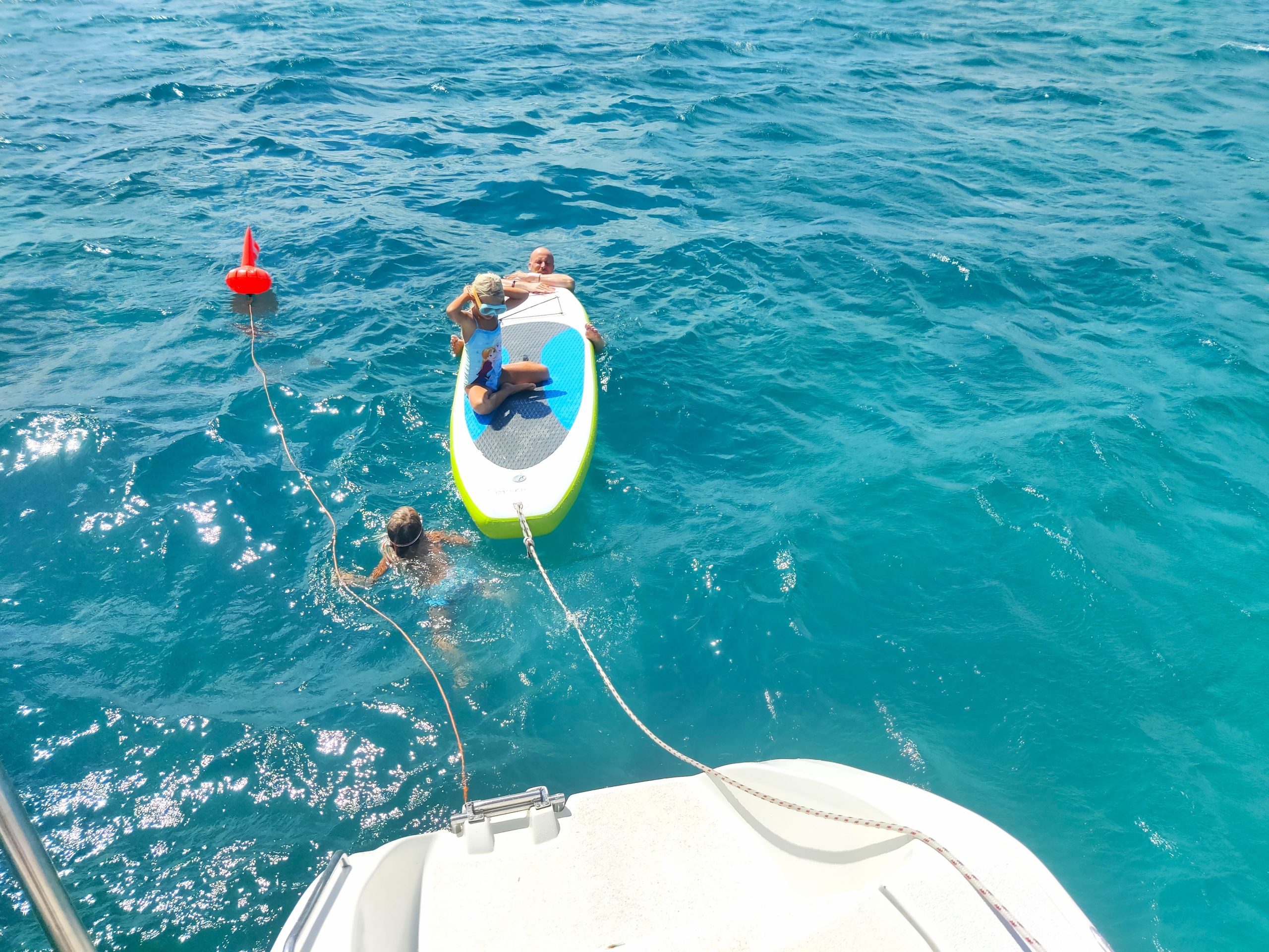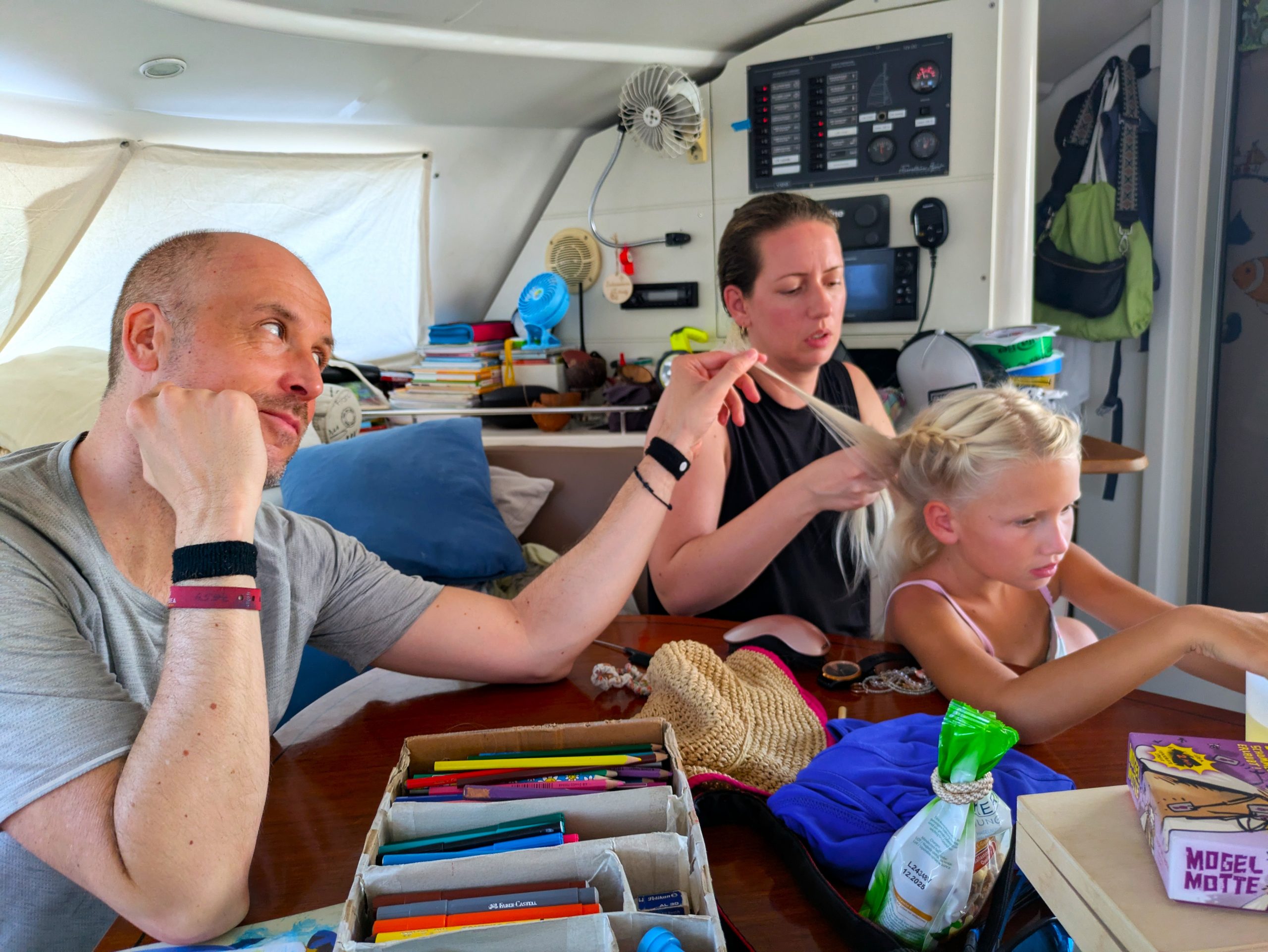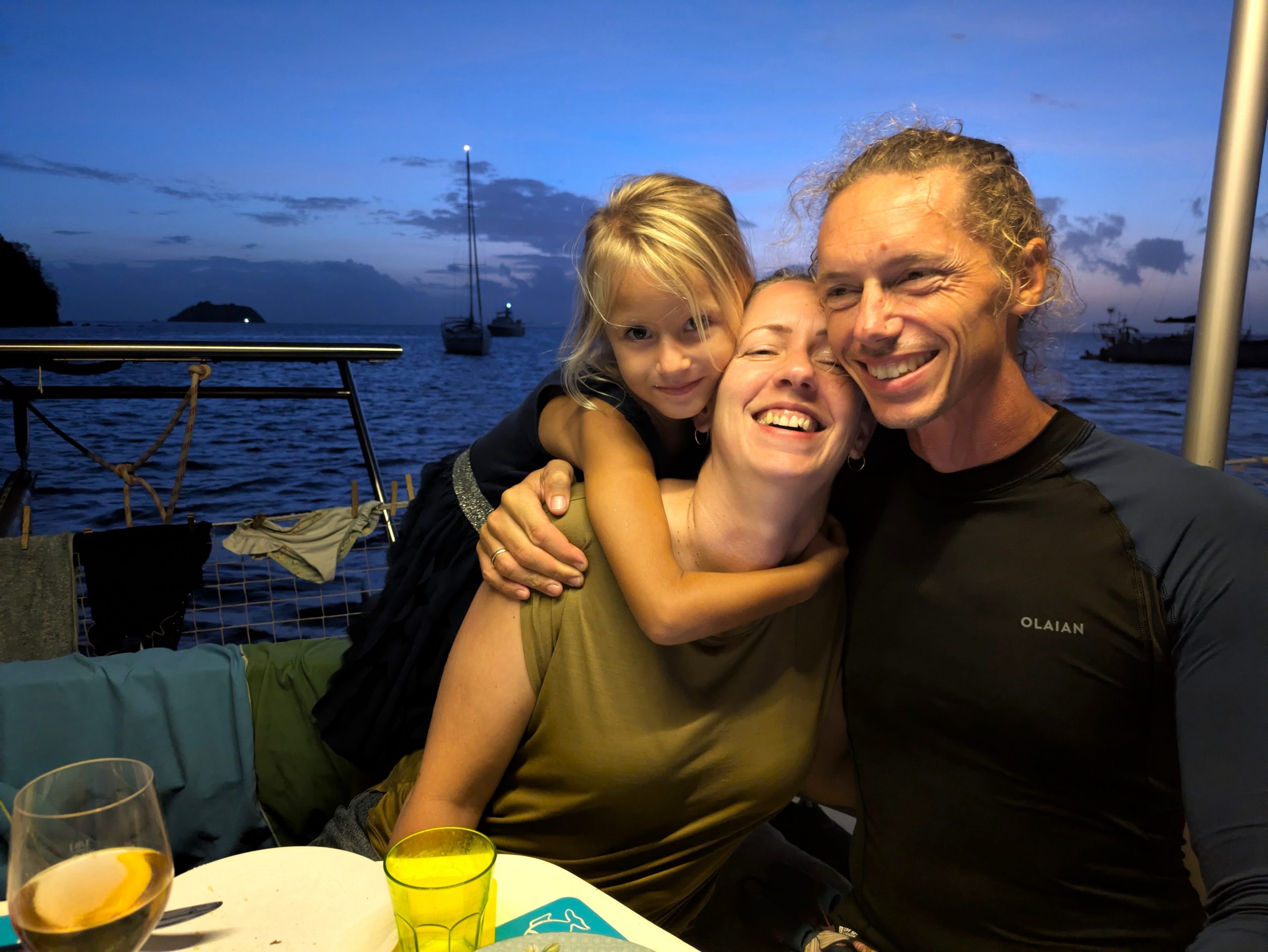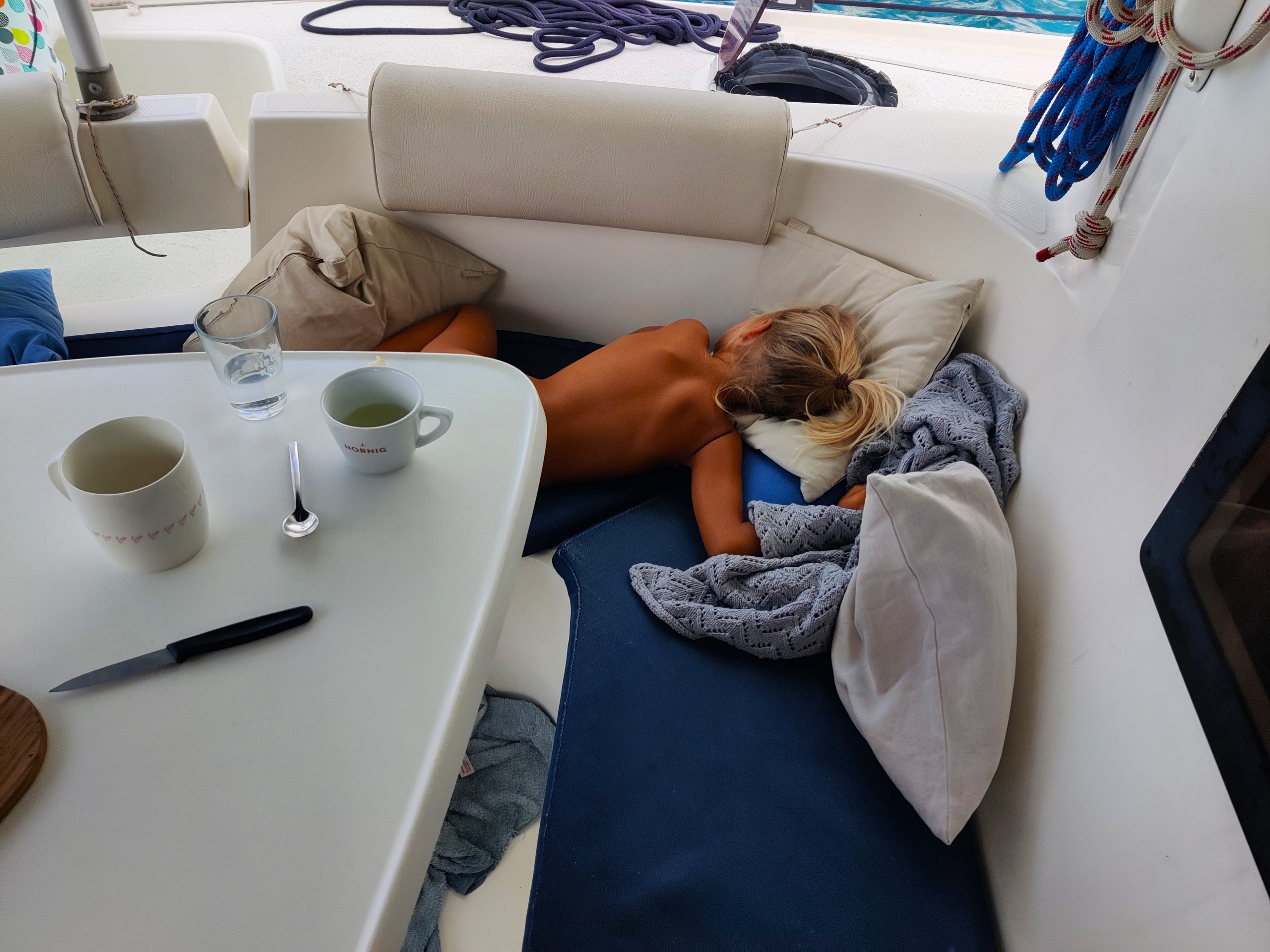 Coole Geschichte: Hier in der Bucht haben wir durch Zufall mitbekommen, dass unsere Dorothea locker und ohne Probleme mit ihren vier Jahren auf 3,5 Meter Tiefe tauchen kann und uns ins Wasser gefallene Sachen hochholen kann. Die drei Mädels machten einen kleinen Wettbewerb, wer die Sachen am schnellsten holt. Noch bevor bis drei gezählt wurde, war Dorothea schon unten und brachte alles nach oben. Wir waren sprachlos und total baff, wie entspannt sie so tief tauchen kann. Ein richtig großer Stolz für uns und auch für ihre große Schwester!
