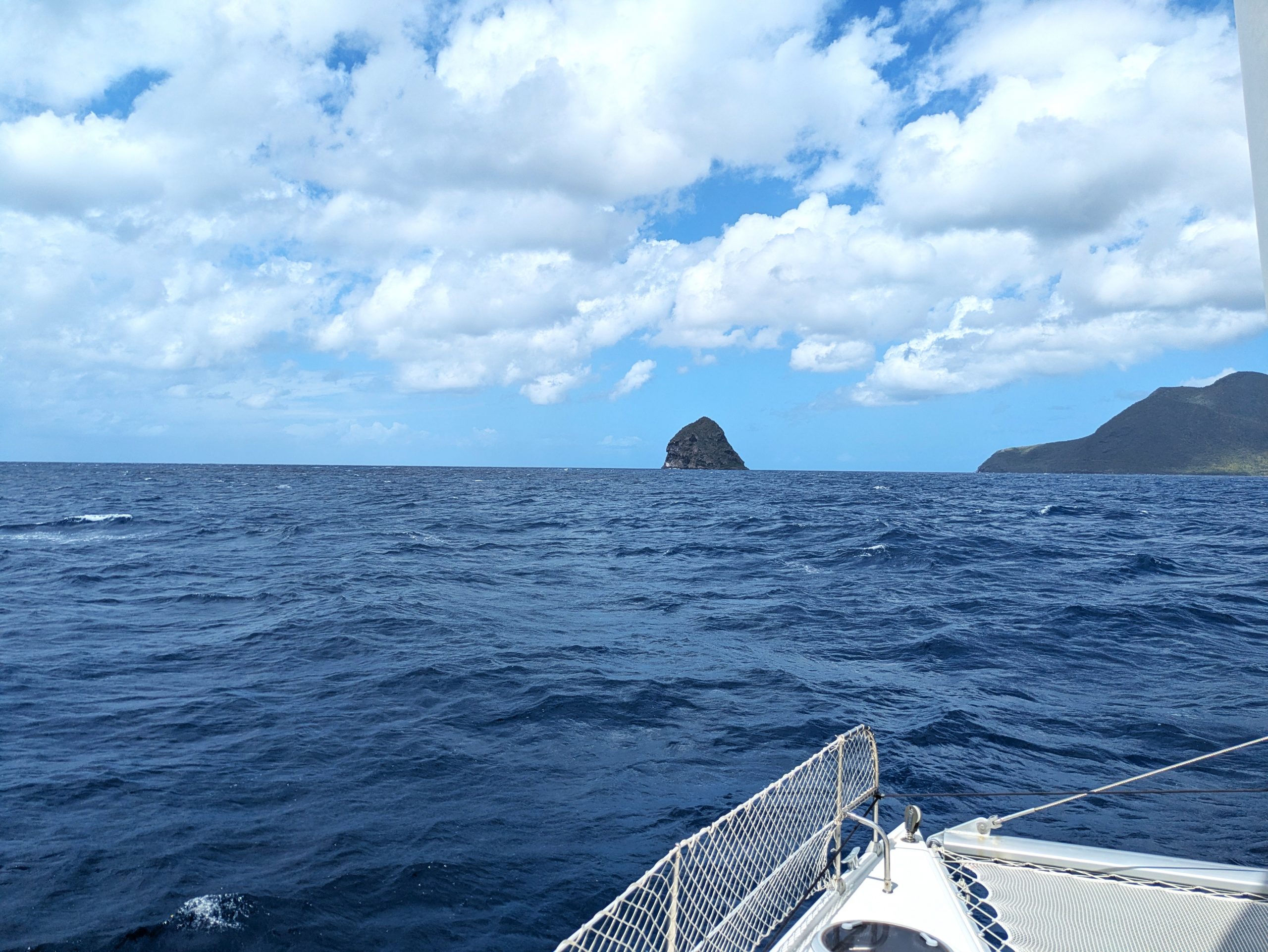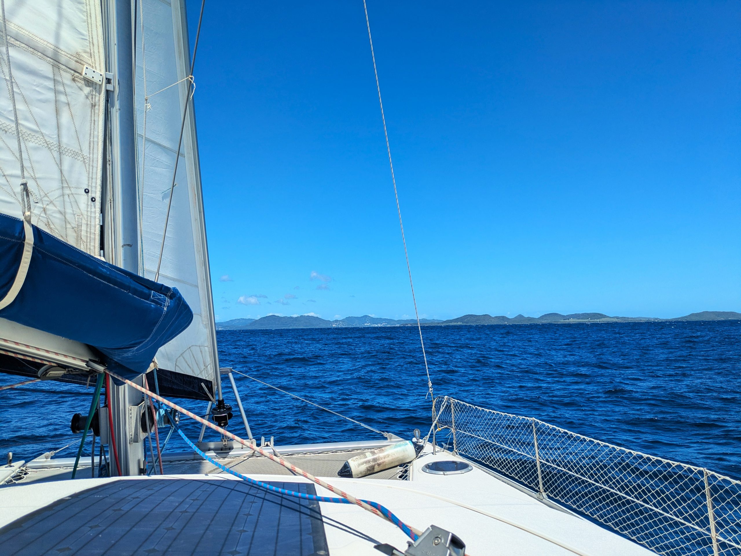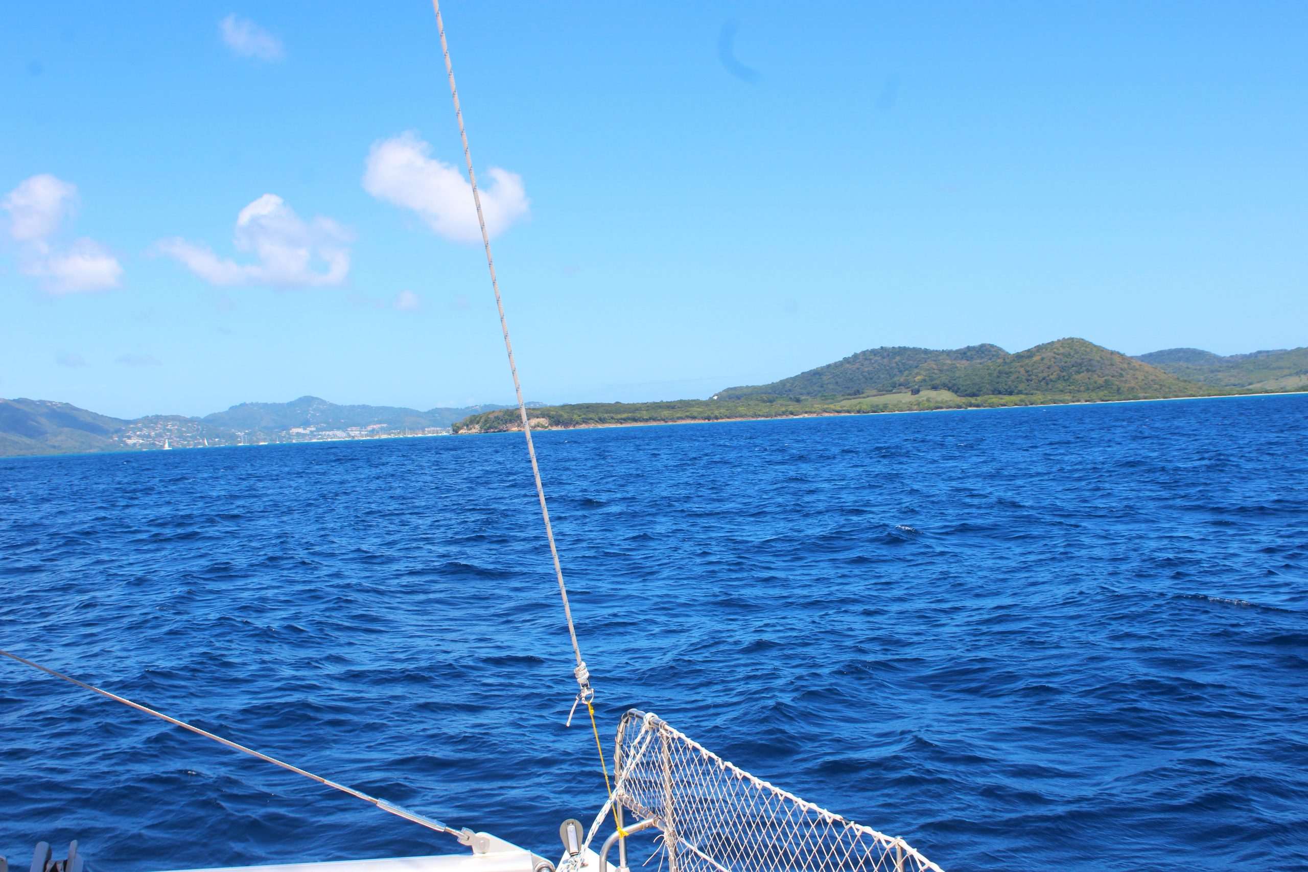 Die Überfahrt von Saint Lucia nach Martinique zählt nicht zu den längsten Strecken in der Karibik, aber sie hat es durchaus in sich. Vor allem, wenn Wind und Welle gut aufgelegt sind. Mit rund 25 Seemeilen ist die Etappe zwar überschaubar, doch wir starten vorsichtshalber mit dem ersten Reff im Groß. Der Wetterbericht kündigt 15–20 Knoten Wind und etwa 1,5 Meter Welle an und genau das bekommen wir auch. Als wir aus dem Windschatten von Saint Lucia herausfahren, frischt es deutlich auf. In den Böen geht’s hoch bis 23 Knoten, die Wellen sind etwas höher als vorhergesagt und schütteln uns etwas durch.