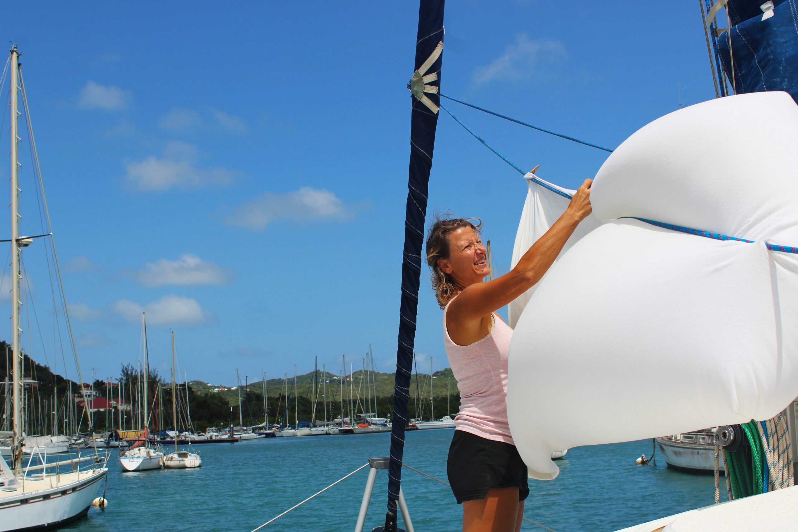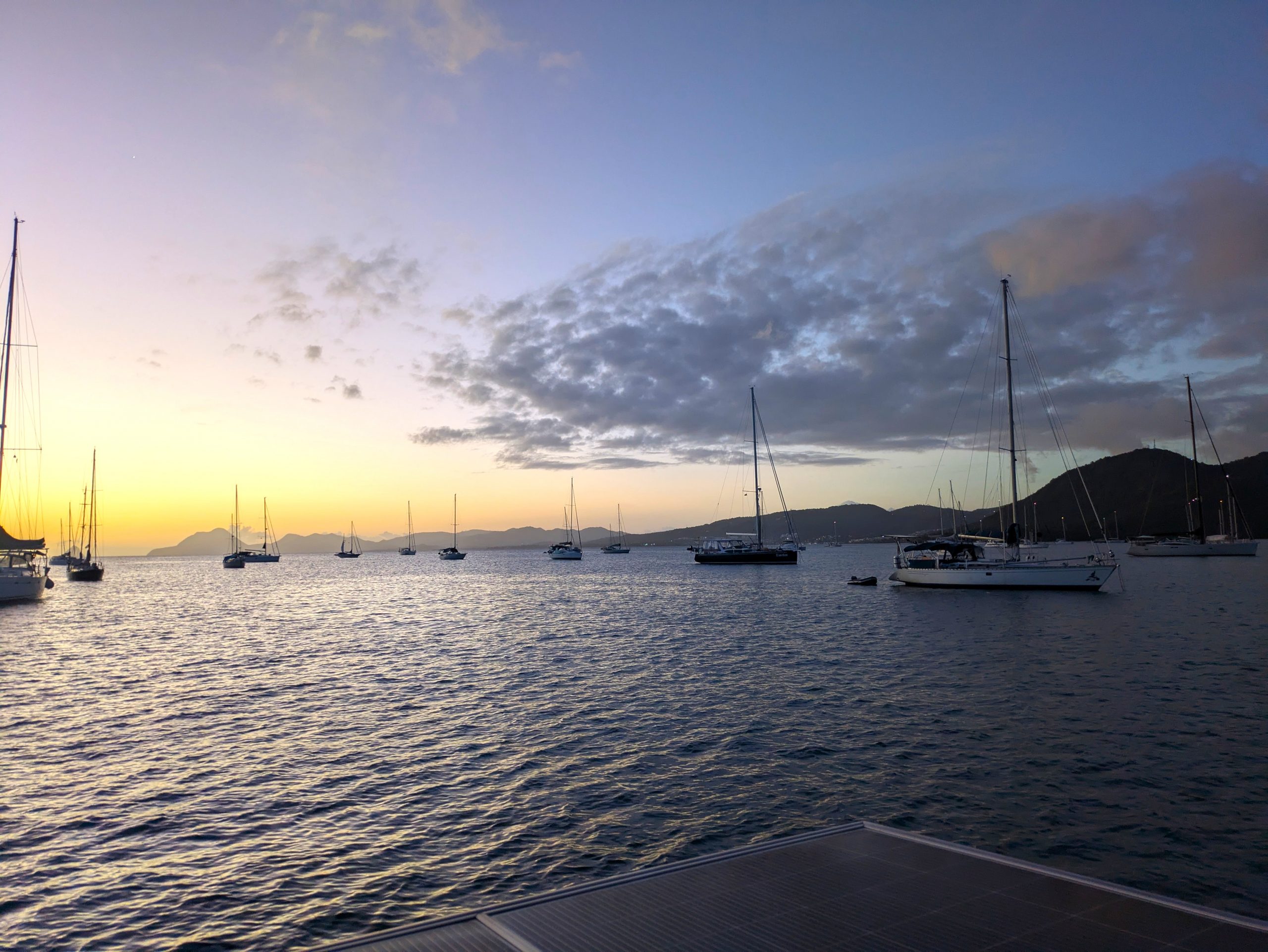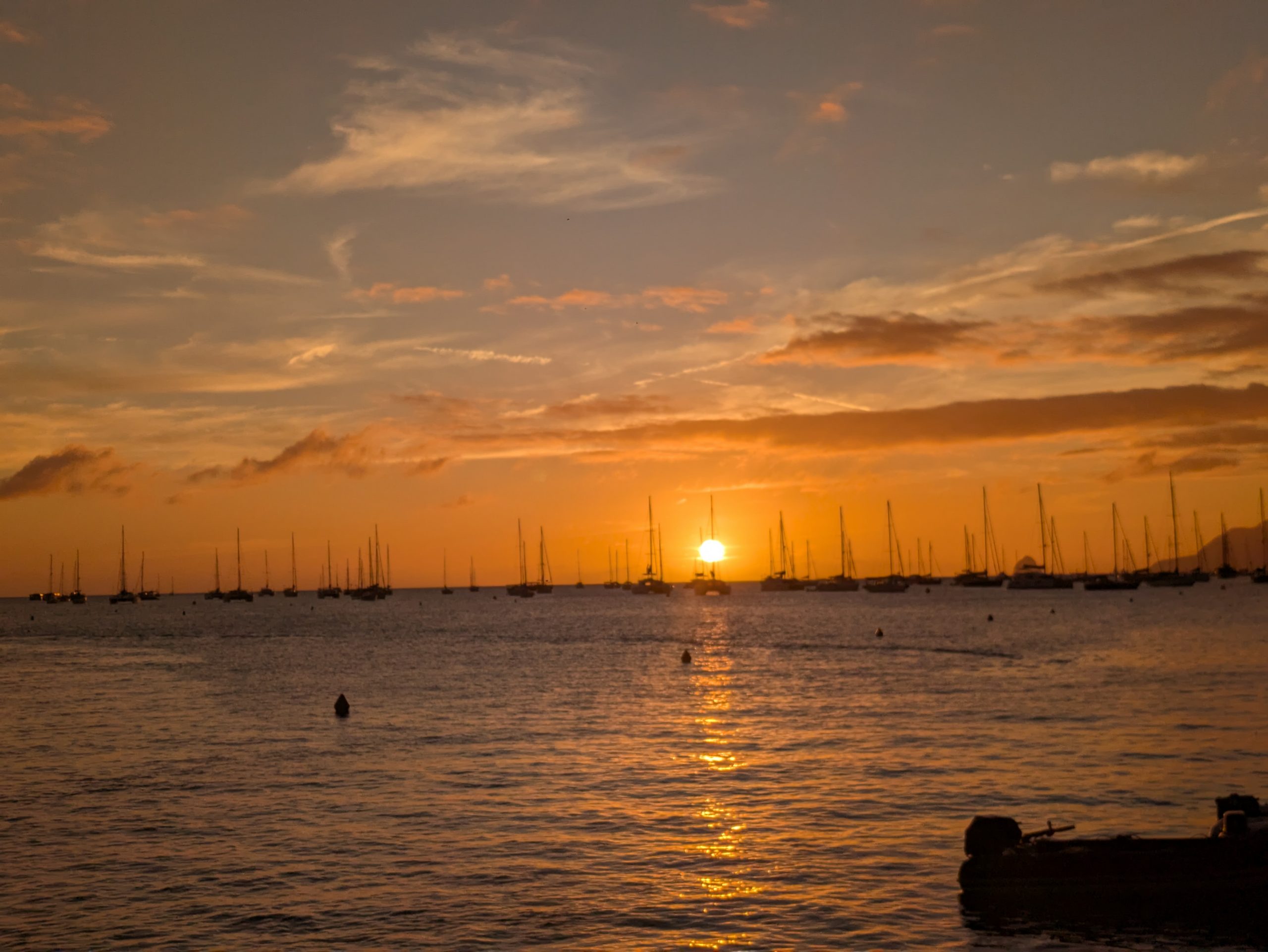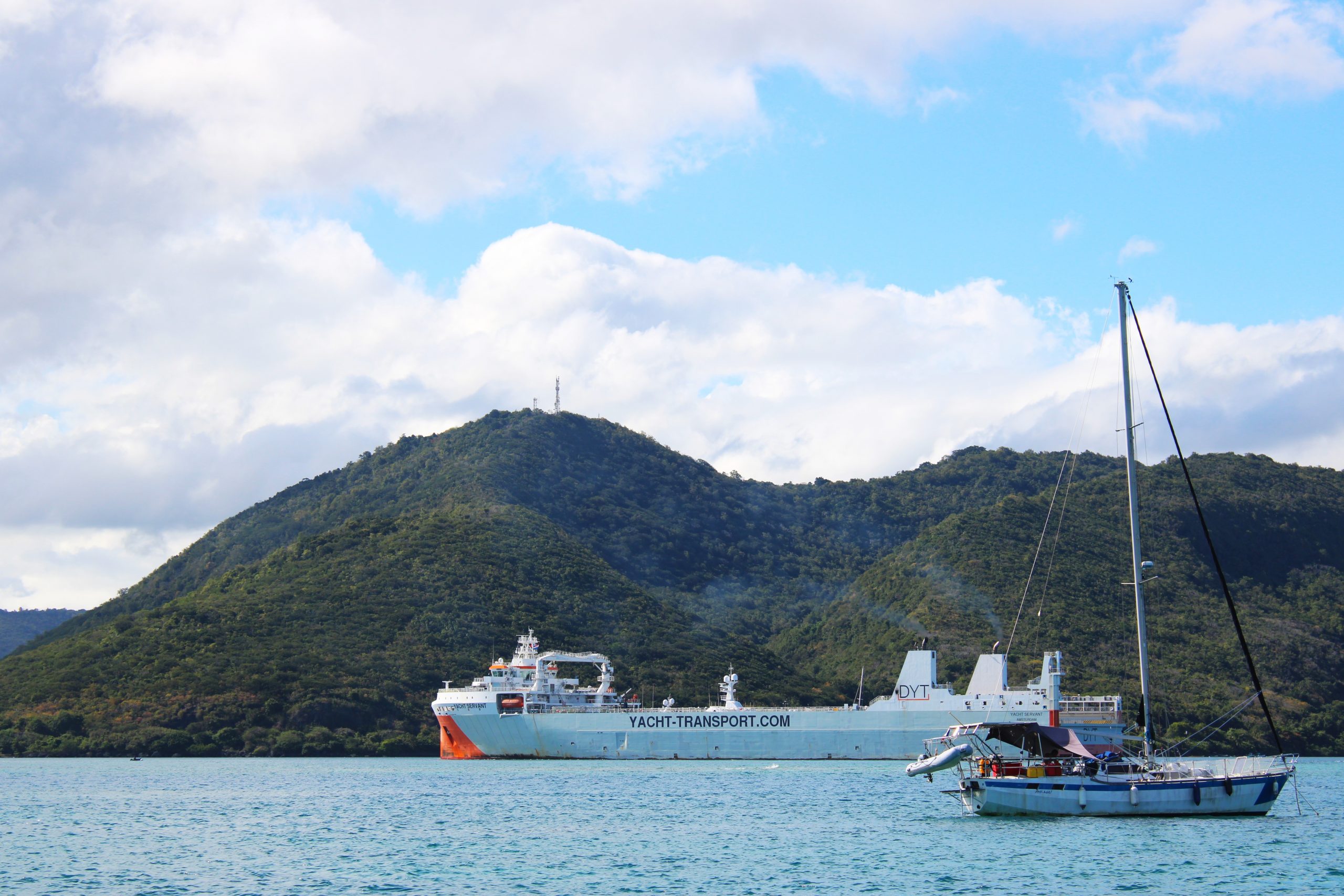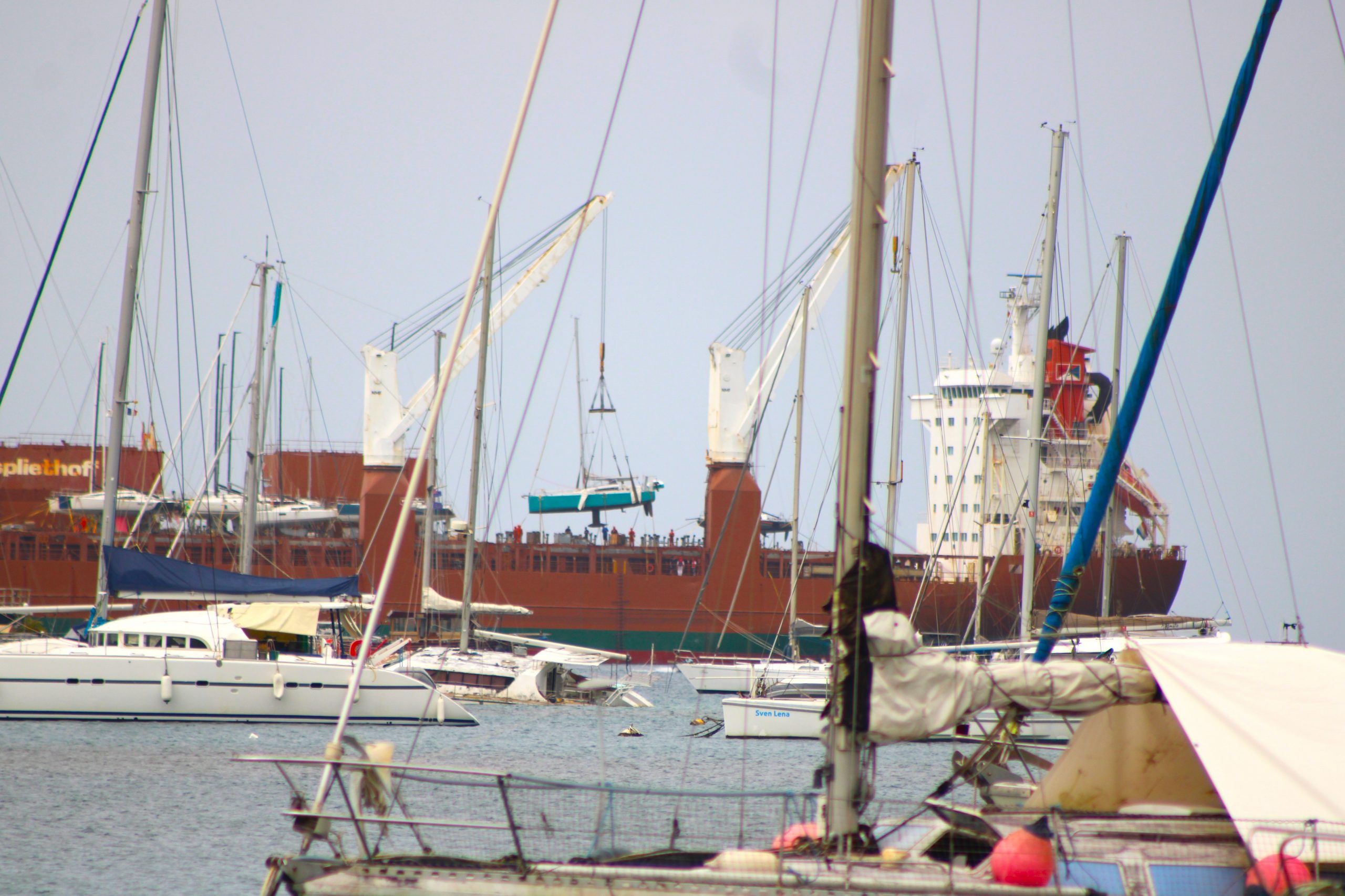 Dazwischen ankern immer wieder moderne, seetüchtige Yachten. Besonders beeindruckend war für uns ein Ereignis, das man nicht alle Tage sieht: Das Verladen von Segelbooten auf ein riesiges Transportschiff, das wie ein schwimmender Parkplatz für Yachten wirkte. Mit Kränen und Gurtsystemen werden die Boote angehoben und millimetergenau nebeneinander verstaut. Ein spannendes Schauspiel. Viele entscheiden sich für diesen Weg, weil sie keine Lust oder Zeit haben, selbst über den Atlantik und die Azoren zurückzusegeln. Andere wiederum verkaufen ihr Boot nach Europa und lassen es so „nach Hause“ bringen, um pünktlich zum Saisonstart im Mittelmeer zu sein. (manchmal handelt es sich hierbei auch um Charterboote: im Winter in der Karibik und im Sommer im Mittelmeer).