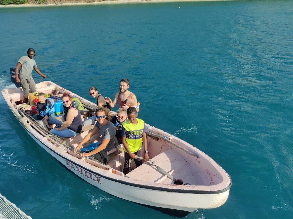 Unter all den Einheimischen war Jacki, trotz seiner knackigen sommerlichen Bräune, leicht zu entdecken. Und während alle anderen um ein teures Taxi buhlten, warteten wir auf einen „Bekannten“ der uns zum Hafen fahren sollte. Die erste Fuhre am Hafen ausladend, deutete dieser „Bekannte“ auf einen Fischkutter und einen Jungen, der uns rüber aufs Boot bringen würde, und fuhr so dann zurück zum Flughafen um Jacki und den Rest von uns zu holen (7 Personen und 80kg Gepäck gingen nicht in den kleinen 5-Sitzer). Die zehn, fünfzehn Warteminuten währenddessen waren dank „All Inclusive“ sehr kurzweilig und im Folgenden eine erste sehr aufschlussreiche Begegnung, die unsere erste Etappe in der Karibik kennzeichnen sollte. Er, zunächst als „Shan “ vorgestellt, erzählte mir etwas von seinem Fischerboot und seinem kleinen Bruder (der kleine ca 13 jährige Junge, der das Fischerboot im Hafen an die Kaimauer brachte), den er unter seine Fittiche nimmt und der noch etwas stärker werden müsste, seinen Träumen, seinem Business, seiner Strandbar und anderen Plänen die er hatte, … und dass wir uns morgen wieder sehen werden, er hat Fisch und Hühnchen für uns und falls wir irgendetwas brauchen, müssen wir ihn das nur wissen lassen. In diesem Zusammenhang viel immer wieder „All Inclusive“, wobei ich erst später Verstand, dass es scheinbar sein Spitzname ist.